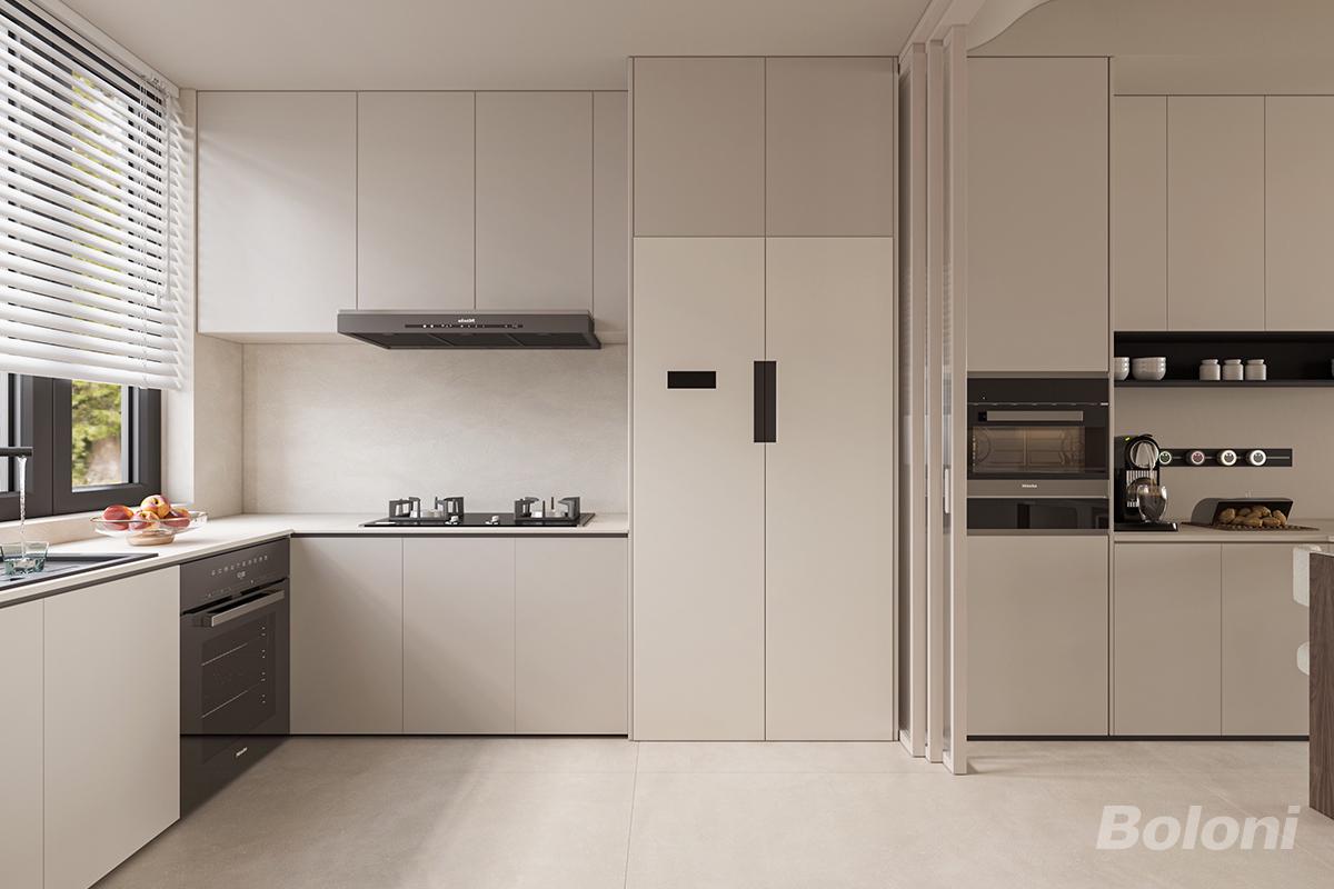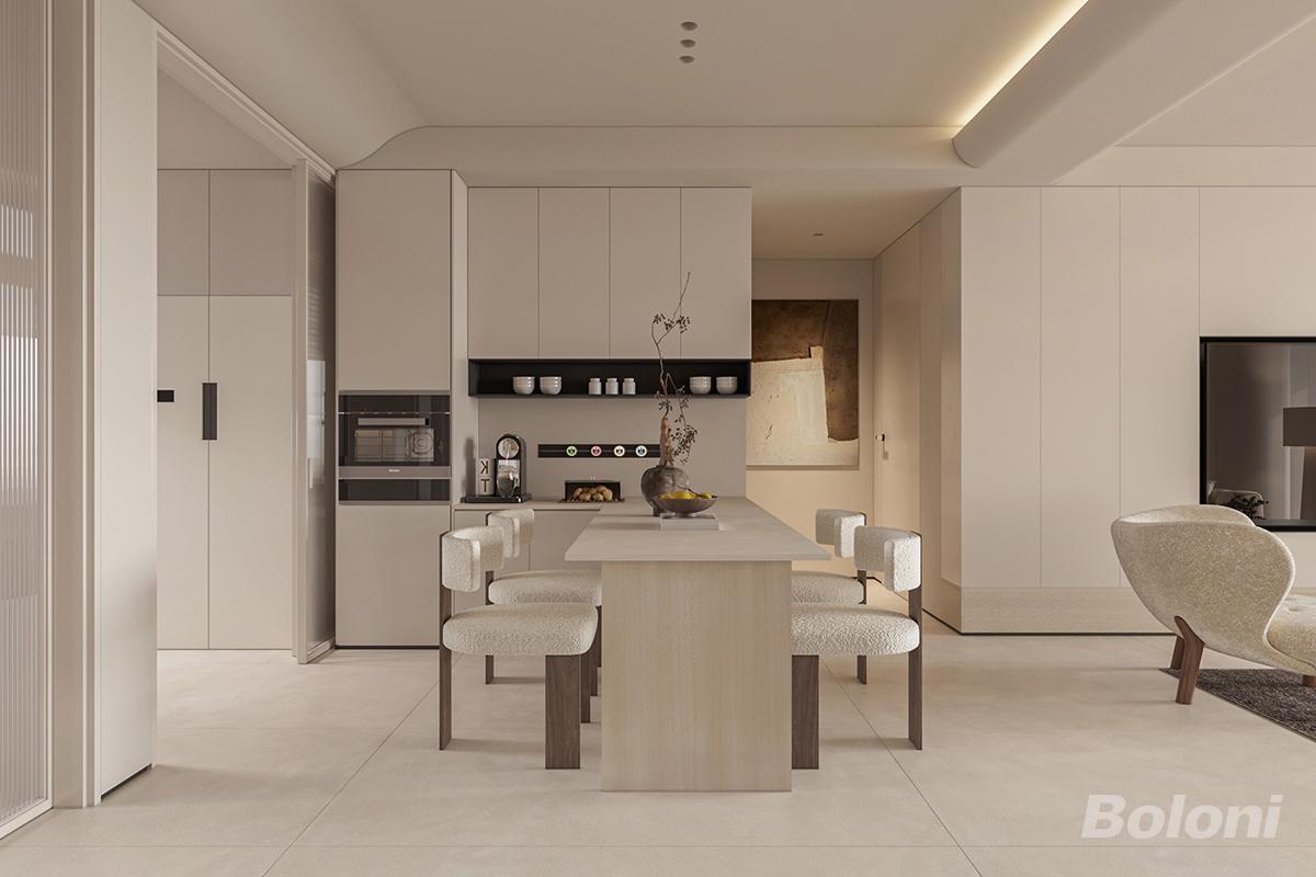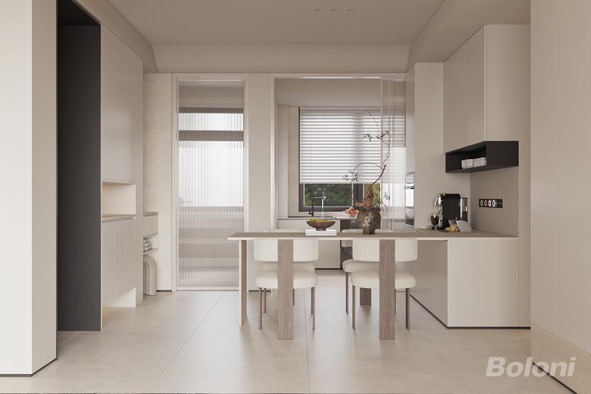 该餐厨区以奶油极简为核,浅调柜体隐嵌厨电,黑灰细节点缀层次。长虹玻璃隔断柔化空间又保通透,岛台 + 软包椅串联餐厨动线,竖百叶引自然光,简约软装适配开放布局,营造松弛有序的互动式餐厨氛围。
