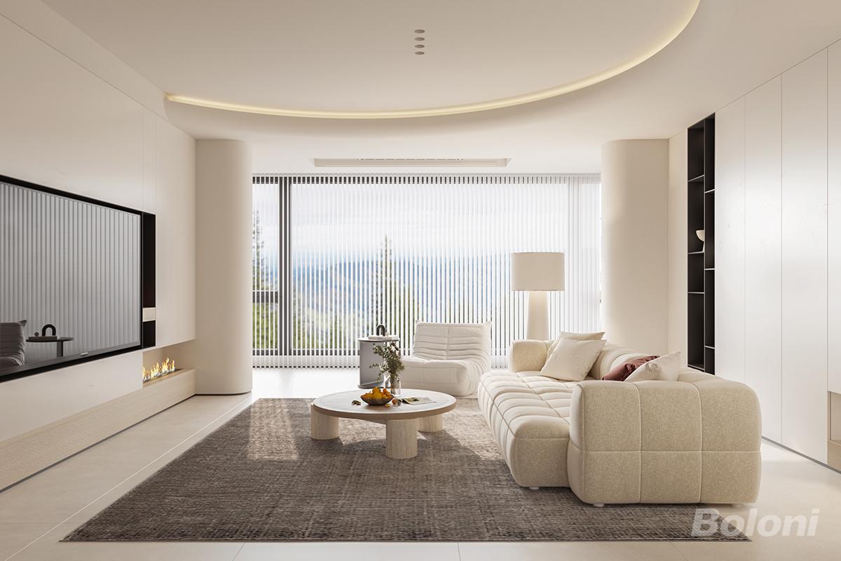 此客厅以奶油极简为基调,弧形吊顶 + 线性灯柔化空间,一体化柜体藏嵌电视与壁炉,显整洁高级。软包家具搭纹理地毯增舒适,红色摆件点睛,开放式布局联动餐厨,借自然光与低饱和色调,营造松弛且通透的居感。