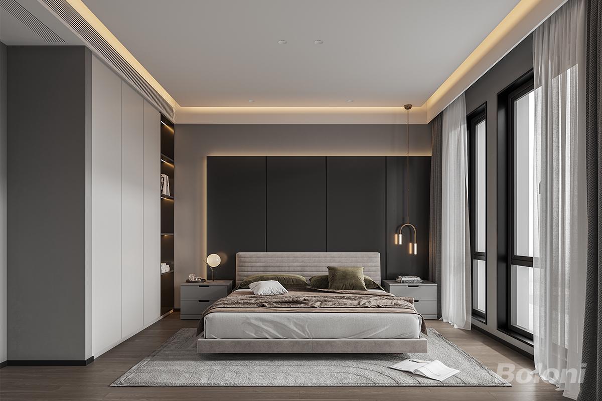 南次卧室光线很明亮,是年轻夫妻房,喜欢厚重沉稳的调性,背景墙采用黑橡木加上墙板灯的设计,空间层次感和灯光氛围感强。