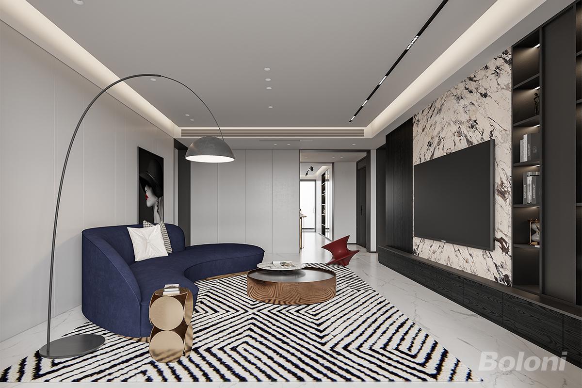 意式轻奢风格是业主喜欢的调性,整体式电视墙的设计加上不规则分割的纯色墙板,跳色沙发使空间更具有灵动性。