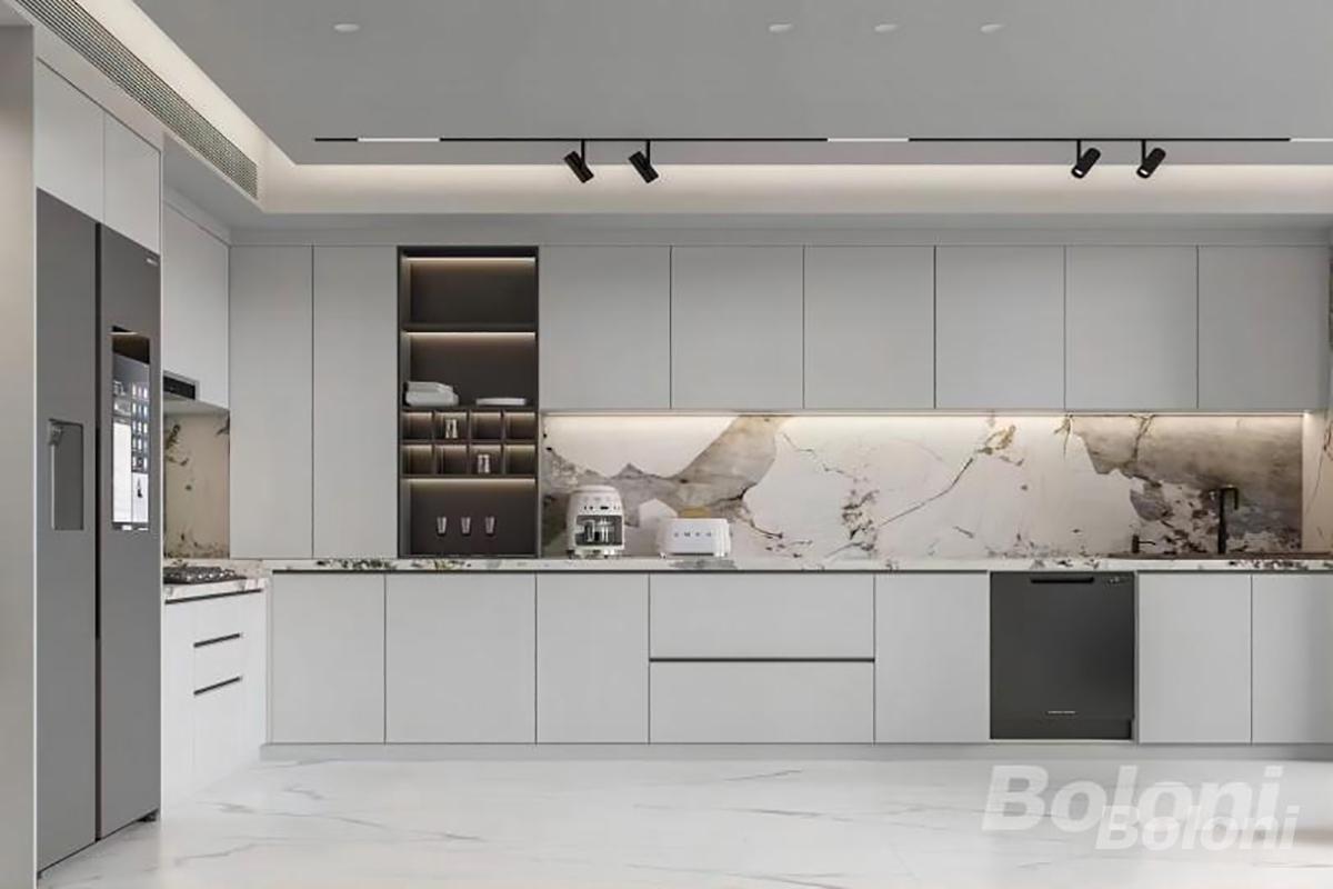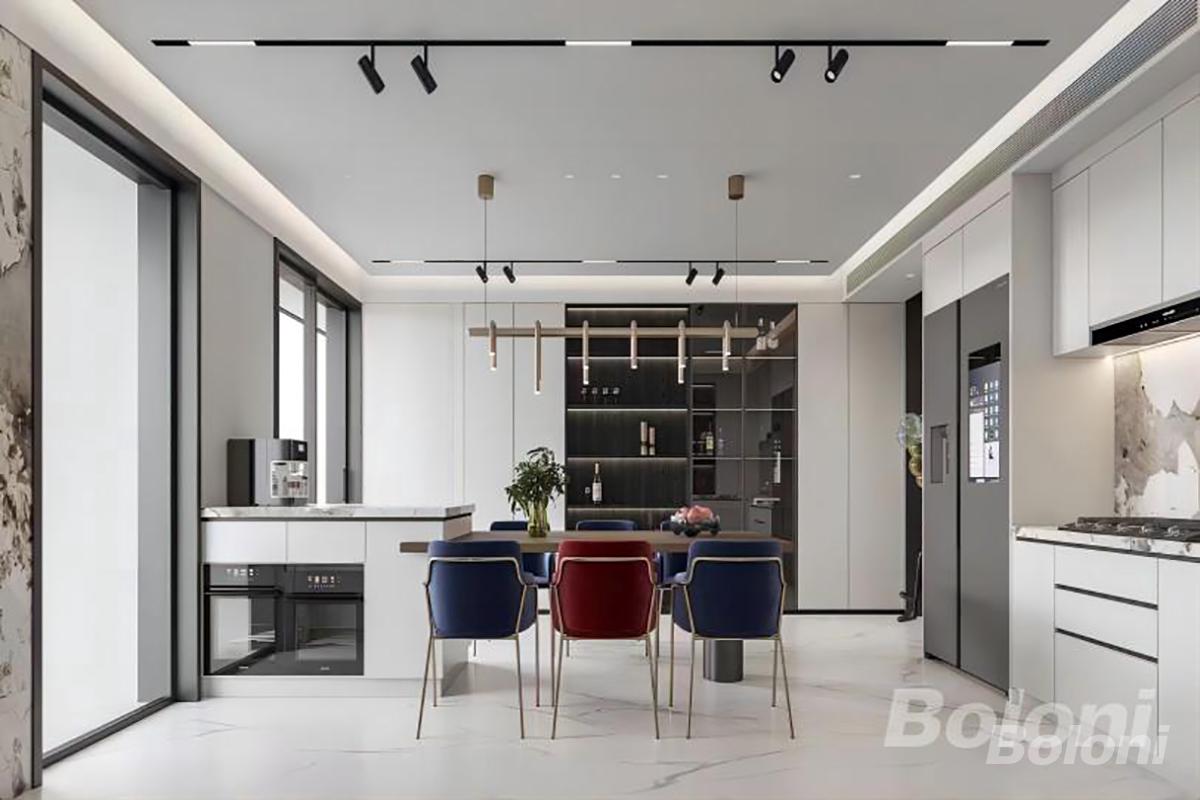 原有户型的厨房是半开放式的中式厨房,空间打开全开放式西厨,餐厅岛台与餐桌融合,餐边柜与酒柜整体设计,收纳满满。
