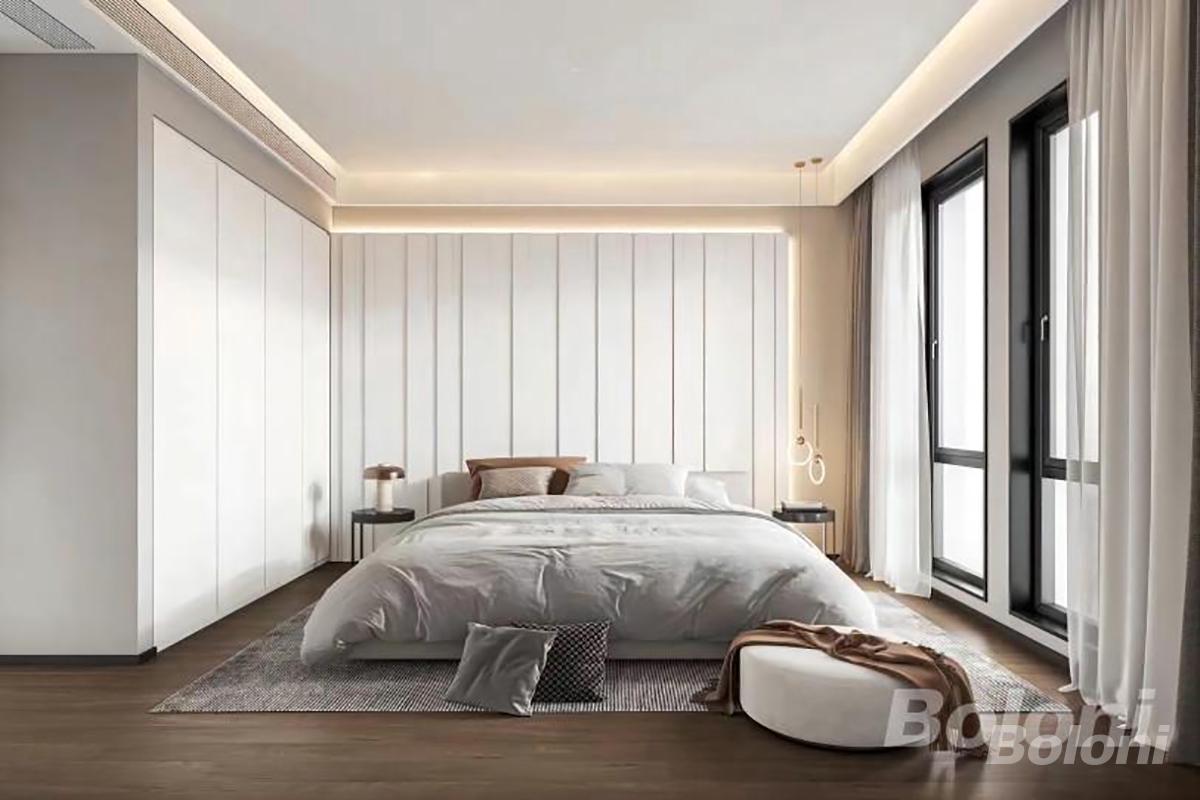 在北次卧室光线不是很明亮的情况下,用浅色背景墙,加上墙板灯的设计,空间层次感和灯光氛围感都表现的充分。