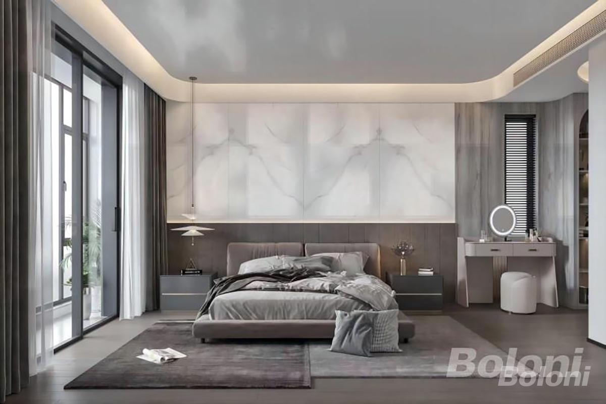 主卧室把原有的衣帽间取消后,扩大了空间感,独立的梳妆台区域紧邻主卫,动线合理,光照充足,岩板与木质墙板相结合的背景墙意式感强。