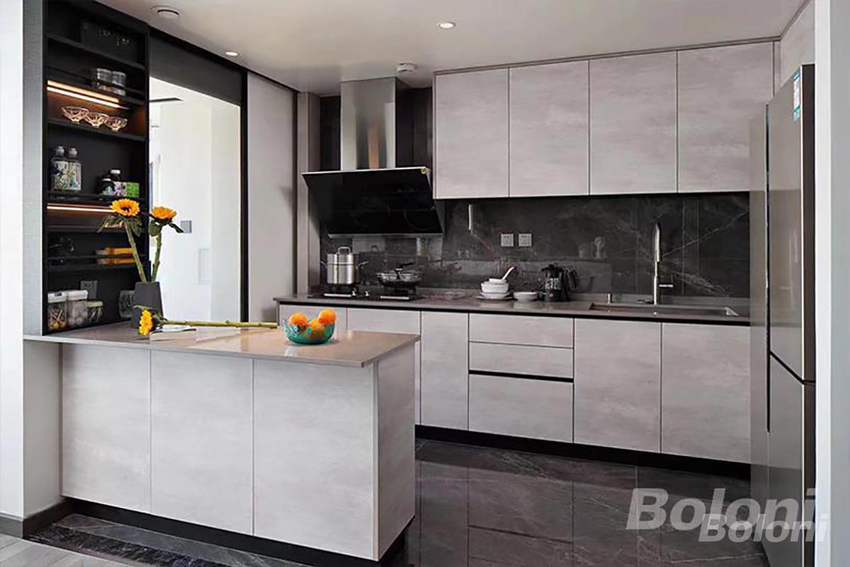 实景照片,现代极简的开放式厨房,利用阳台承重墙垛做了一体式岛台设计,增加了空间的互动性与延伸性,采光更加明亮。