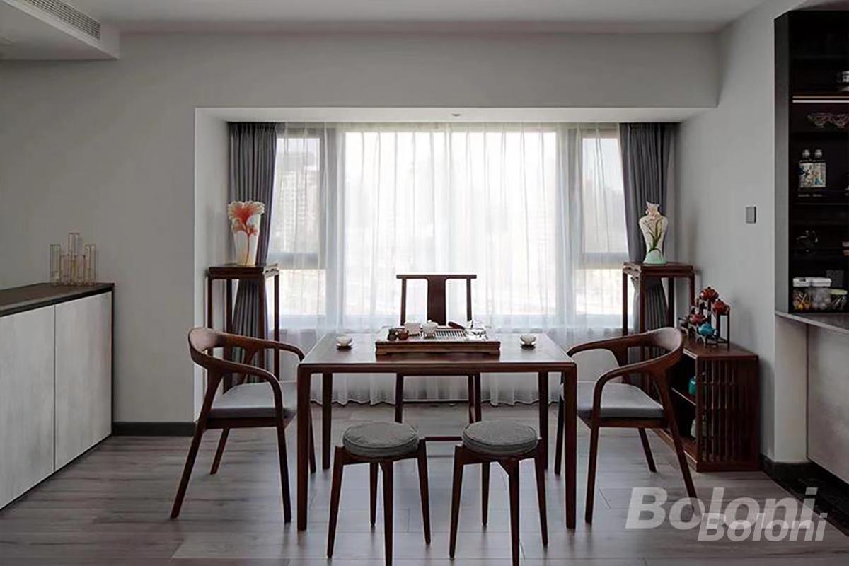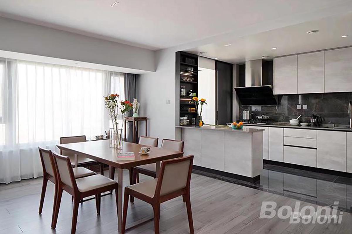 实景照片,业主原有的实木餐桌、餐椅、茶水柜、中式花架等,与现代极简的定制厨房相融合,毫无违和感的诠释了现代新中式风格。