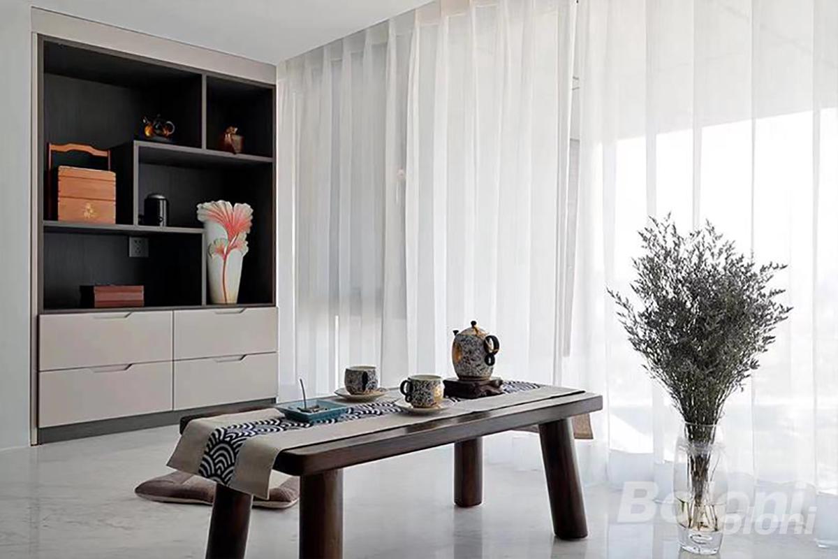 定制收纳柜可有序收纳茶具、摆件与杂物,满足实用收纳需求;简约茶桌搭配通透采光与雅致软装,营造出宁静的品茗氛围,让空间既具备日常茶歇的实用功能,又成为一处能让人静享慢时光的禅意角落。