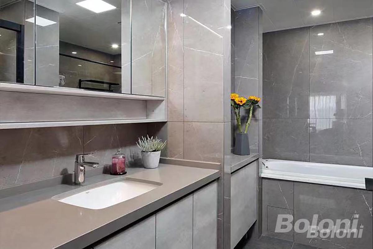 镜面柜兼具收纳与增强采光的实用功能,台盆与柜体设计贴合日常使用习惯,同时通过花艺绿植点缀,在实现实用便捷的基础上,更营造出轻奢雅致的沐浴氛围,让每一次洗漱都成为舒适的享受。