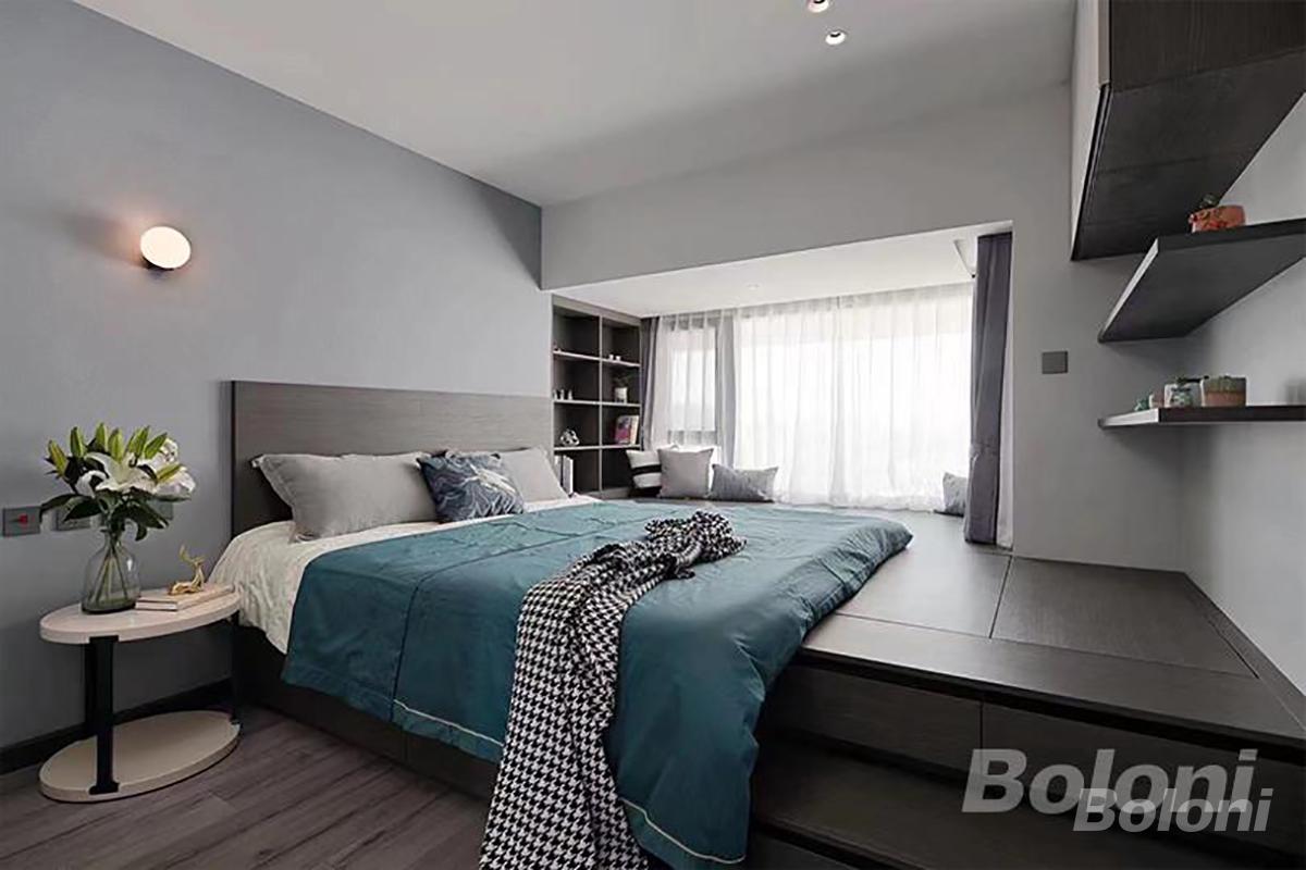 地台设计兼具收纳与休闲功能,定制柜体满足物品归置需求;柔和灯光与通透采光营造惬意氛围,同时通过软装搭配提升空间质感,让卧室既实现日常休憩的实用价值。