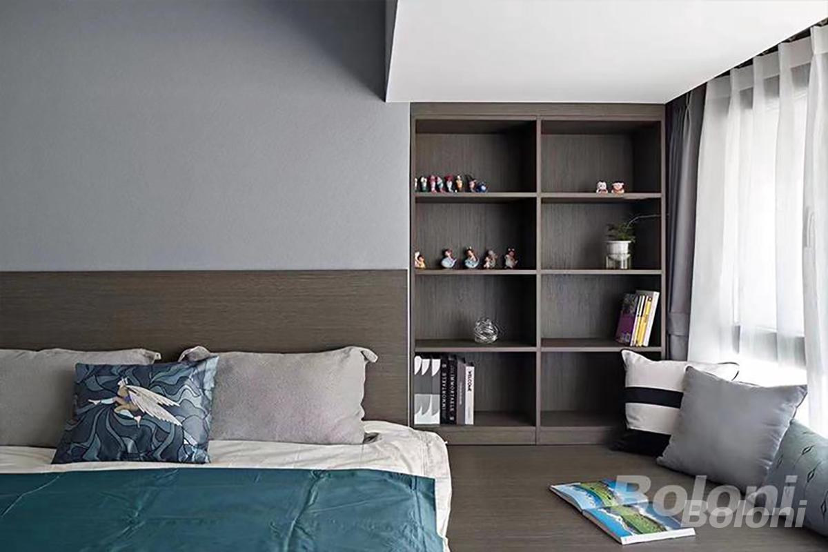 定制的格子收纳柜,既能有序收纳书籍、摆件,又能作为空间的装饰亮点;床品与软装的搭配营造出静谧舒适的休憩氛围,同时利用采光优势提升空间通透感,让卧室在满足日常收纳。