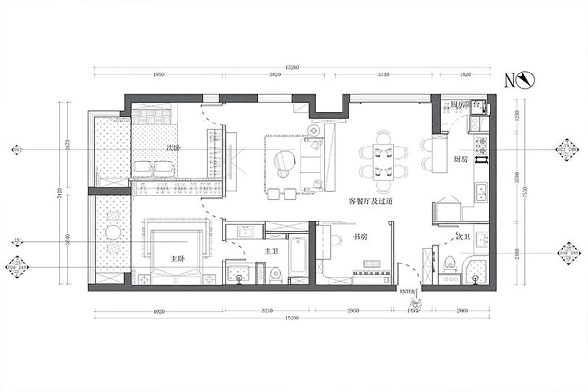 整个空间格局做了非常大的调整,将封闭式的厨房打开,利用采光窗,做纵向的客厅、餐厅、厨房一体,使空间的视觉感最优。