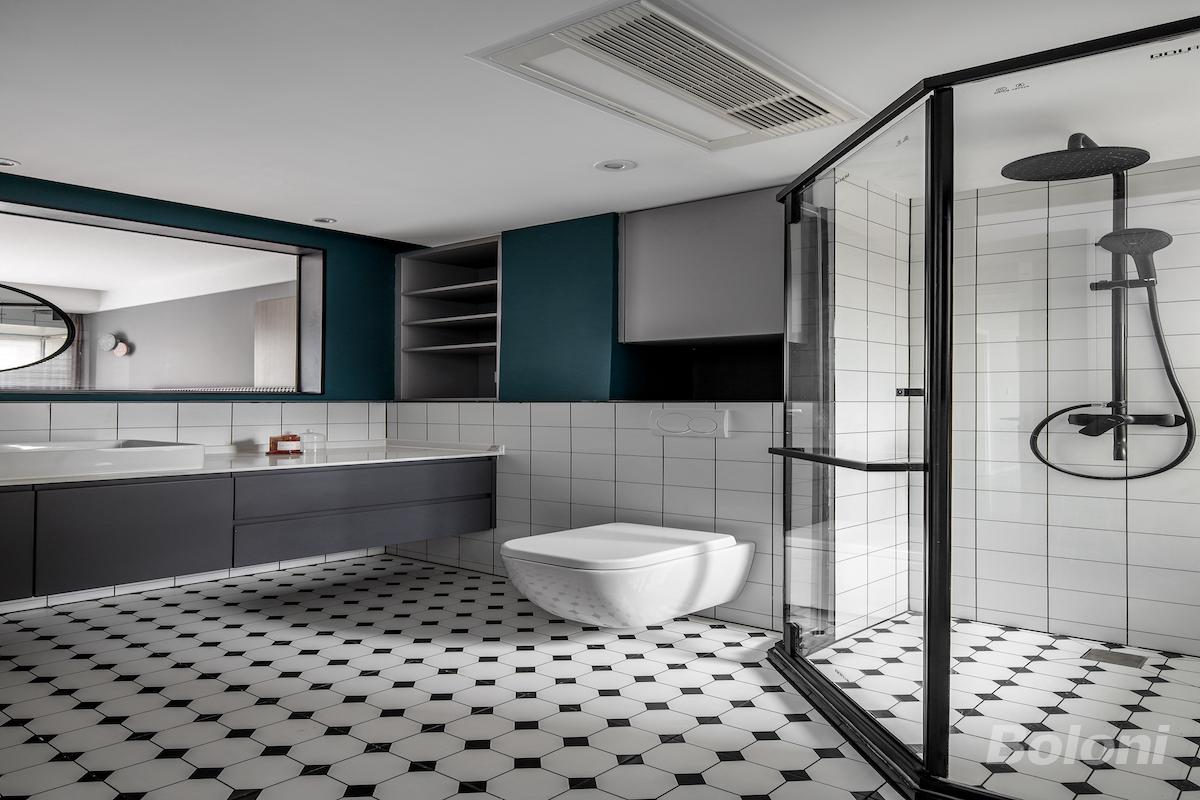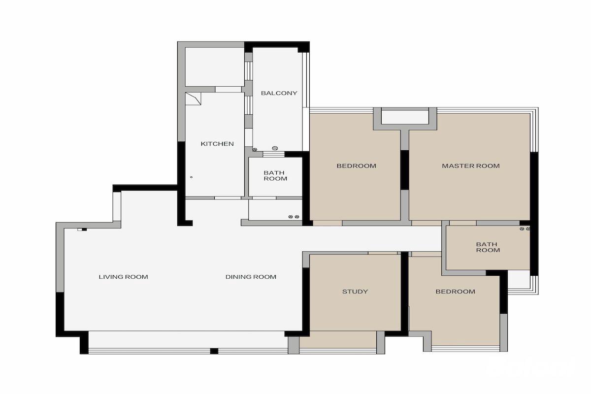 改造后户型解析: 1. 厨房与卫生间湿区借助后部空间进行后移,在不影响使用面积的情况下增加西厨部分,再将原始干区墙体拆除用玻璃隔断进行代替,增加采光的同时,优化使用动线 2. 后移卫生间将其扩宽并并入次卧改造为衣帽间,组合为大套房使用