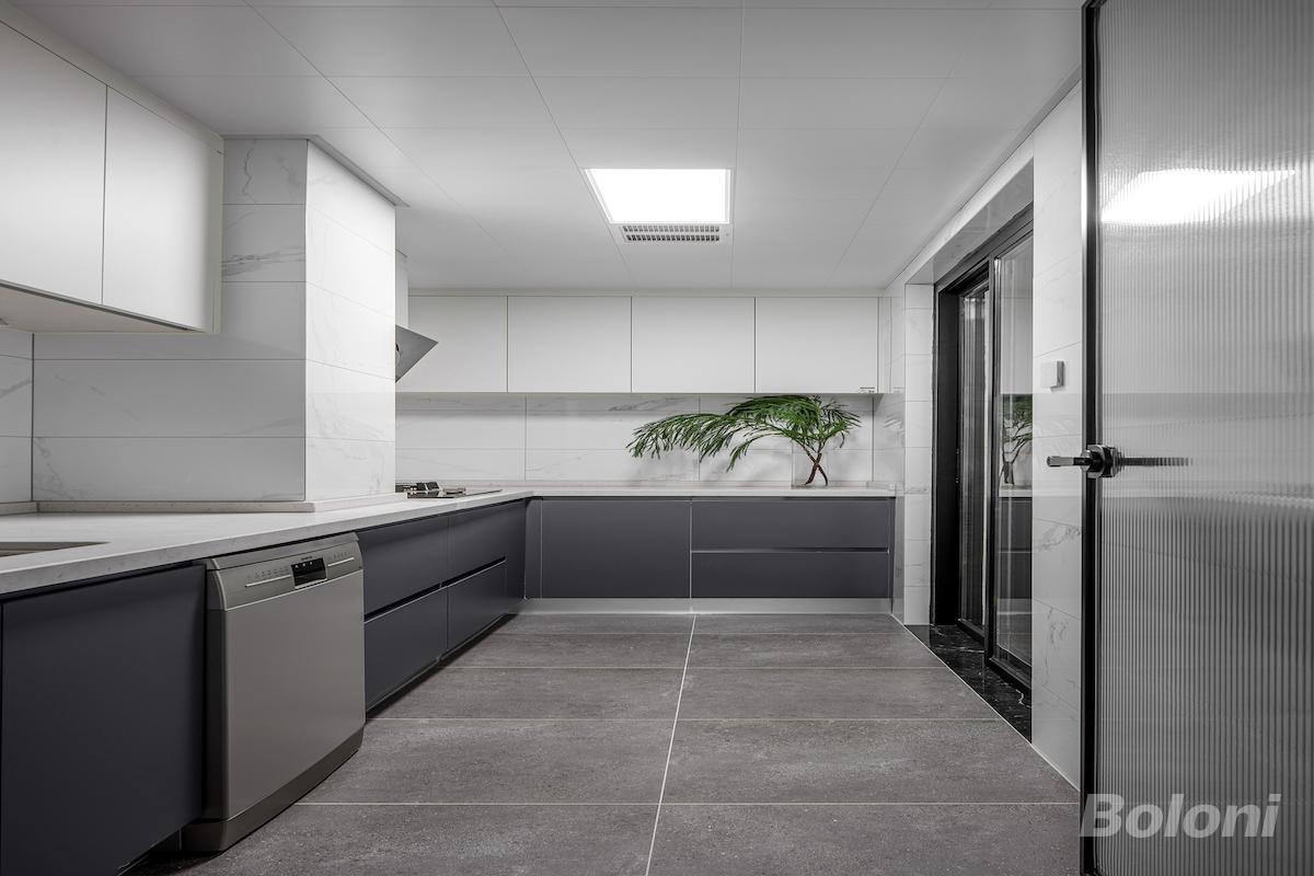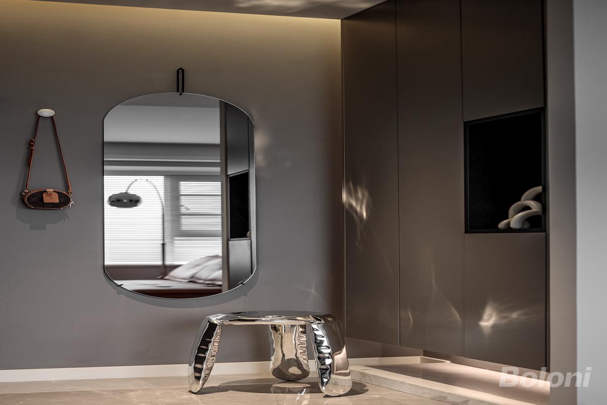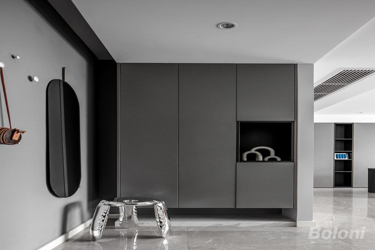 顶部嵌入灯带,光线从墙面漫反射扩散,现代感十足。空间整体以灰色调打底,采用全屋定制设计,封闭与开放格局穿插。百叶窗将外界的自然光线充分引进室内,然后将家具与物品看似随意但合理布置其所处方位,在不影响使用功能的前提下,让这间房屋彰显出自己的风格。