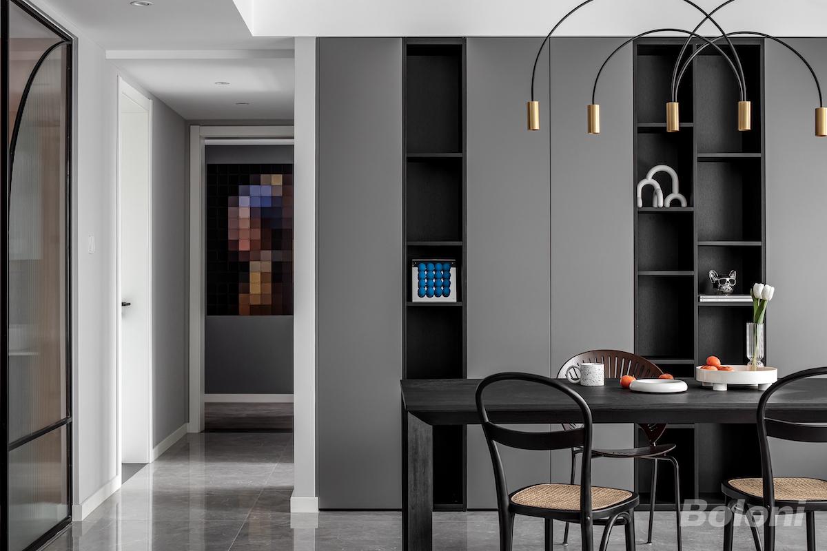 黑色长方形餐桌搭配复古藤编餐椅,带来与传统餐桌氛围不同的用餐格调。靠墙储物柜采用2:8法则,封闭与开放组合排序,可以放置各自喜爱的不同元素风格的装饰品进行展示。并且用黑色与灰色加以区分,让空间不显呆板。