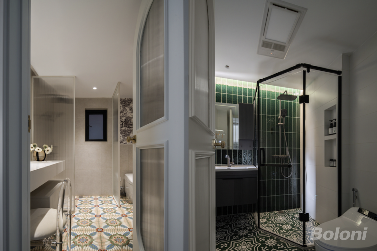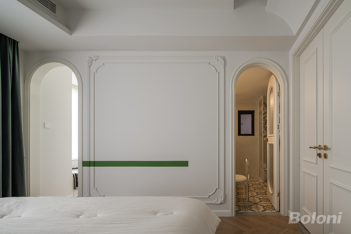 利用弧形元素为空间增添几何美感,对称造型升级仪式感。依次为衣帽间、投影留白、以及主卧卫生间。卫生间在足够的面积支撑下将功能设计为干湿三分离,以玻璃、花卉图形为装饰元素,营造悠然复古情调。