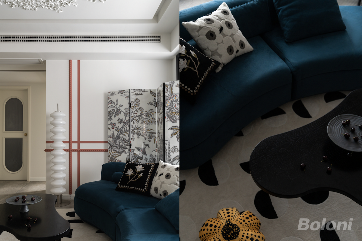 经典蓝聚焦出客厅视觉重心,深邃而饱满的色调,承托出艺术的高雅气质。墙面串联玫瑰粉极简线条,空间呈现出主次分明的秩序感。chanel beige的中古奶油白东方屏风,蕴含自然花草哲学余韵,散发出悠然有灵的意境氛围,同时也是可随意移动的到各个空间中的日常装饰。