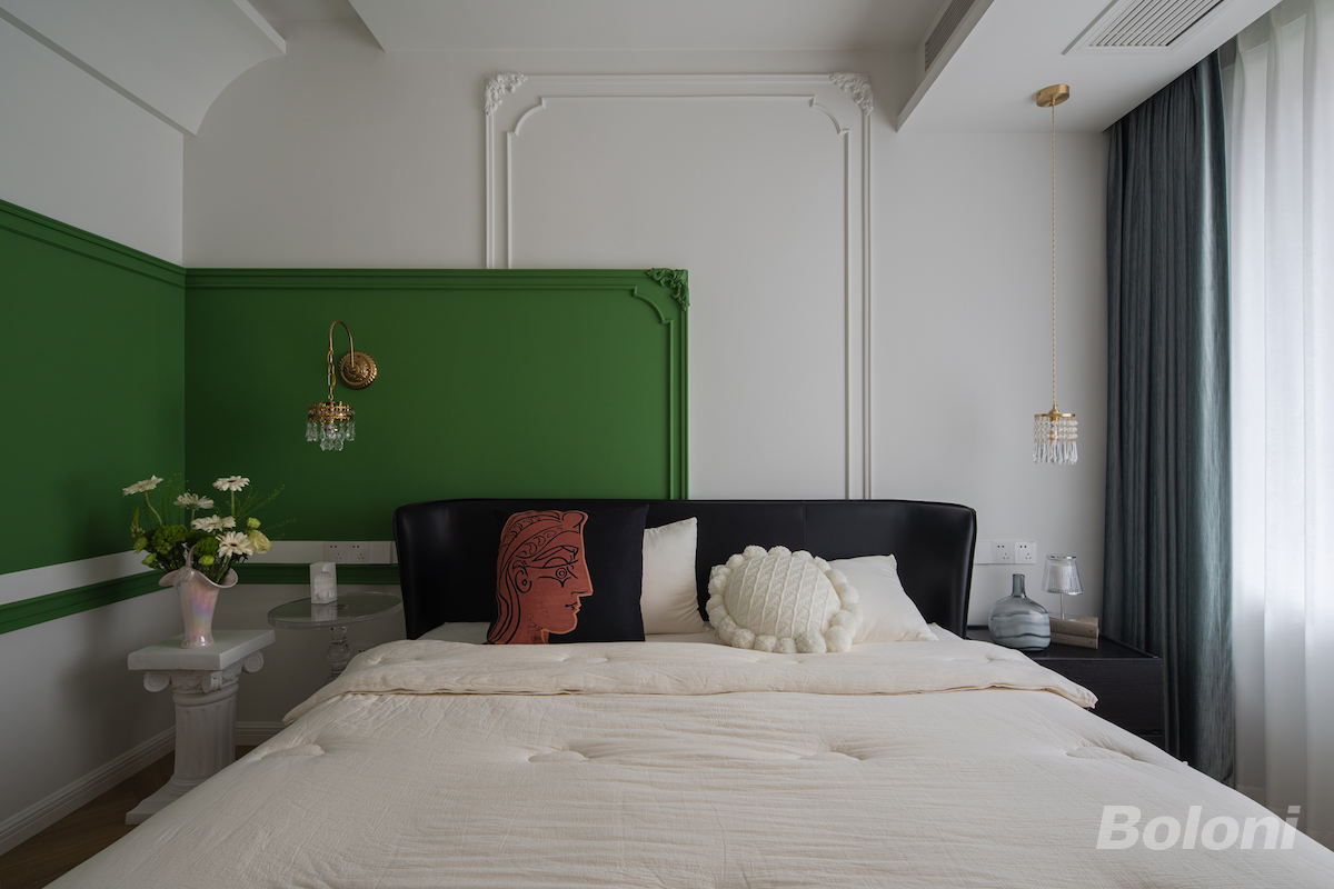 主卧由两间次卧室改造合并后使用,是集睡眠区、衣帽间、卫生间一体的大套房。选择富有仪式感的双开门,在格调上让空间显得更精致大气,并透过玻璃,能够与公共空间在视觉上产生一定的互动关系,赋予更鲜活、更通透的场景气氛。