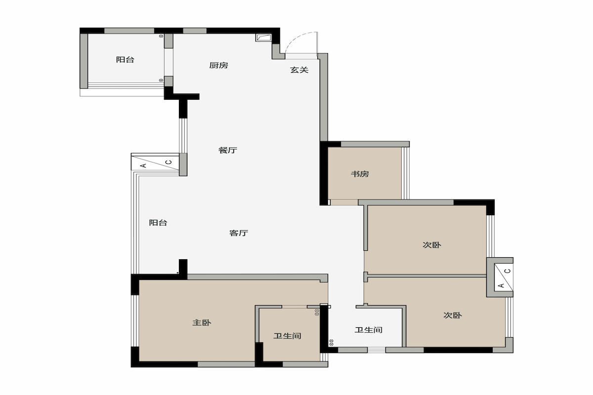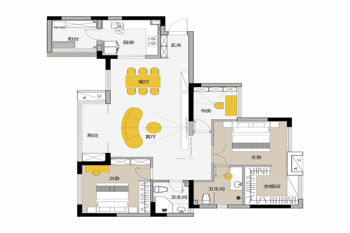 ➊ 合并客厅生活阳台,提高实用率➋ 延伸电视墙体,扩充客厅视觉广度,修正户型格局➌ 原始主卧改为次卧使用,并释放主卫于公共空间充当次卫使用➍ 利用长虹玻璃,设计一条分隔动静区域的走廊➎ 原始次卫与紧邻两间次卧合并为一间集睡眠区、衣帽间、卫生间一体的大套房使用
