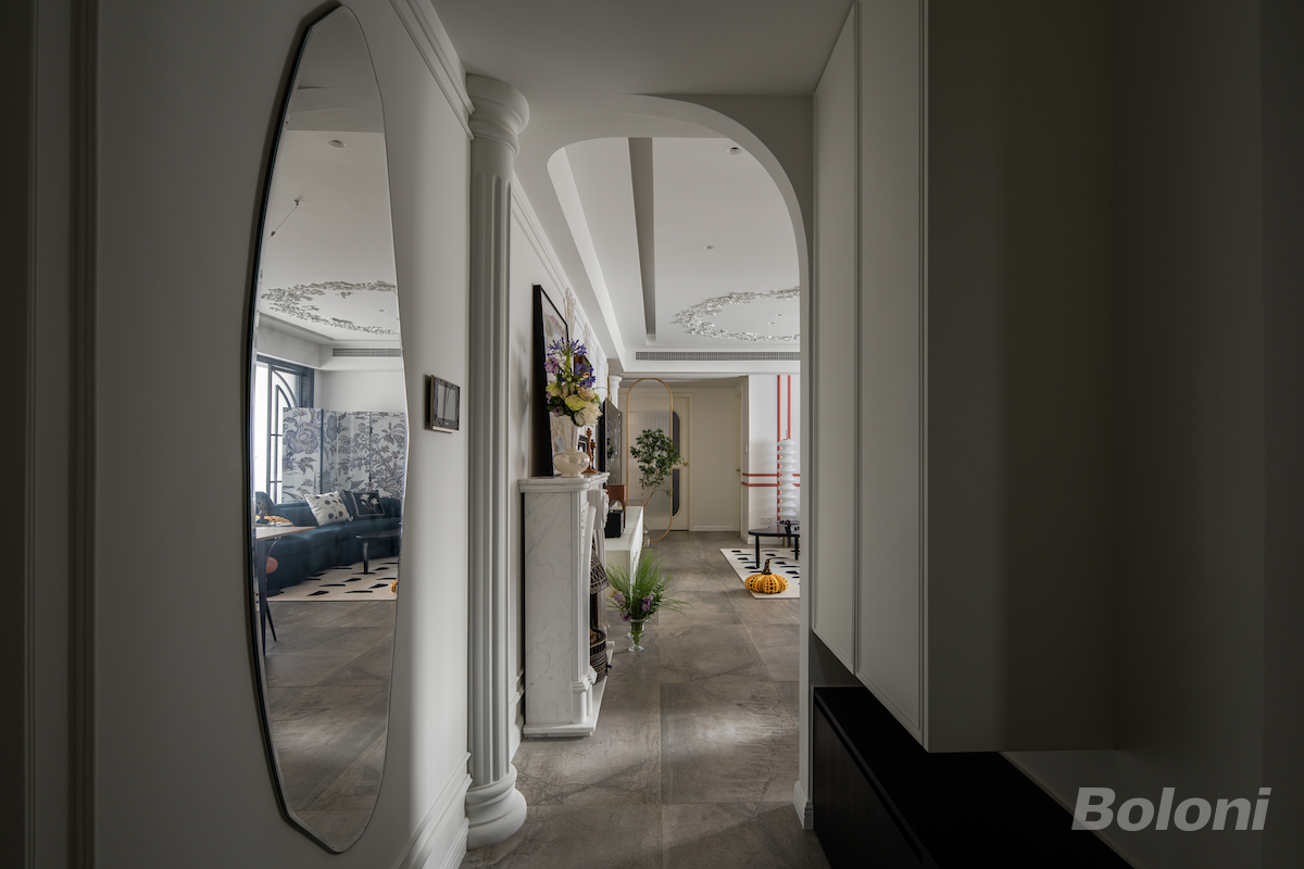 入户处通过小弧角与半罗马柱造型,初建起法式风格氛围基调,在视觉上形成玄关区域,增强进门仪式感。改造后的内部结构通过水平延伸创造出更深广的视野,鲜花、绿植、壁炉、挂画为其营造曼妙的自然氛围,彰显出灵动雅致的美学意蕴。