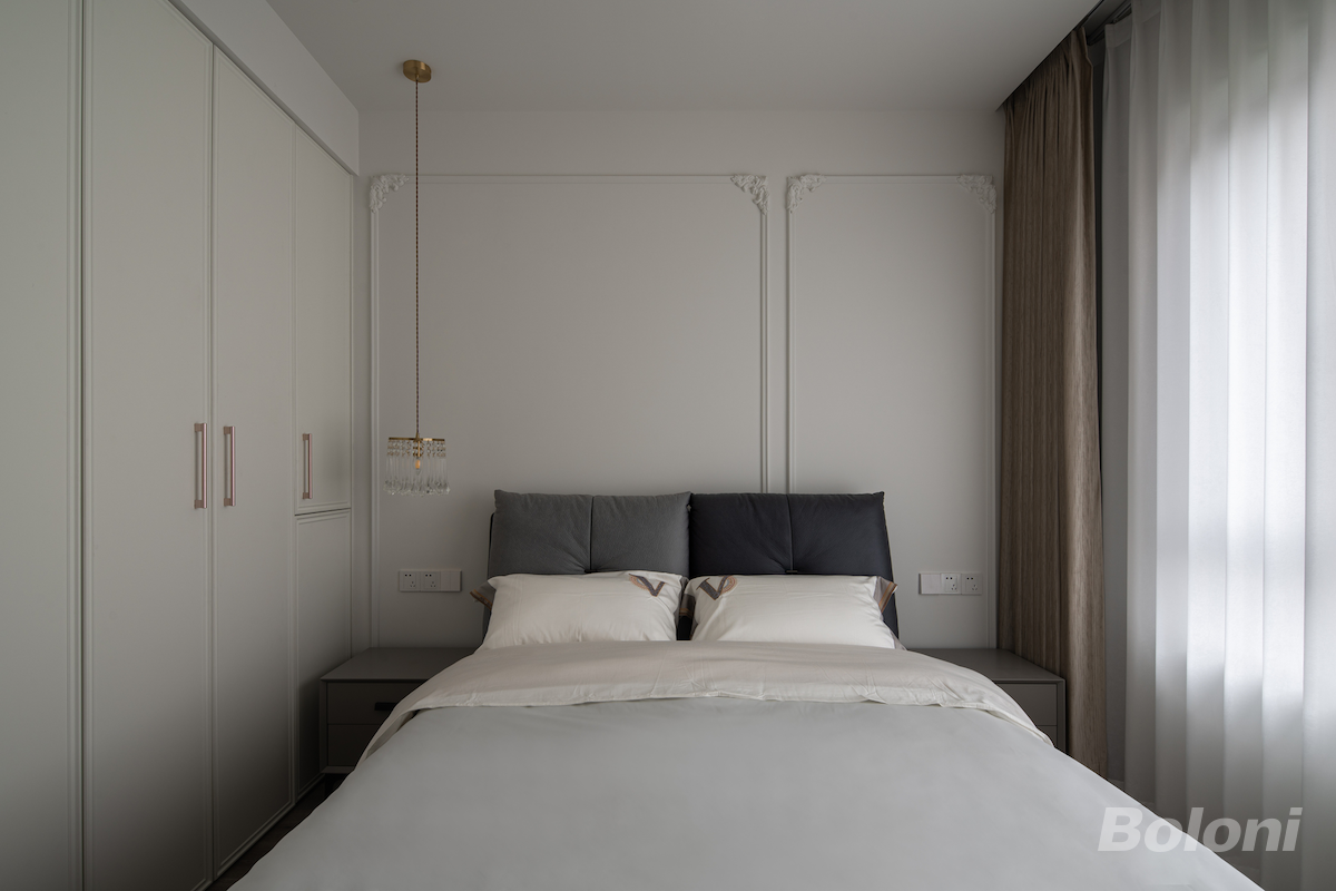 次卧为父母亲友探访时居住,沿用外部空间干净柔和的奶油白,从细节入手,墙面融入简洁的法式线条元素,顶部选择水晶吊灯,营造更纯粹、优雅的空间气质。在功能上,压缩部分客厅空间增加收纳柜,升级储物功能。贴心加入梳妆台,方便母亲到访时使用。