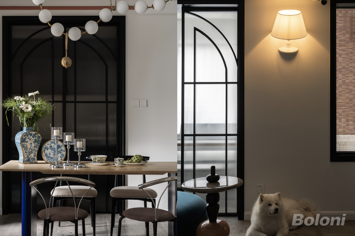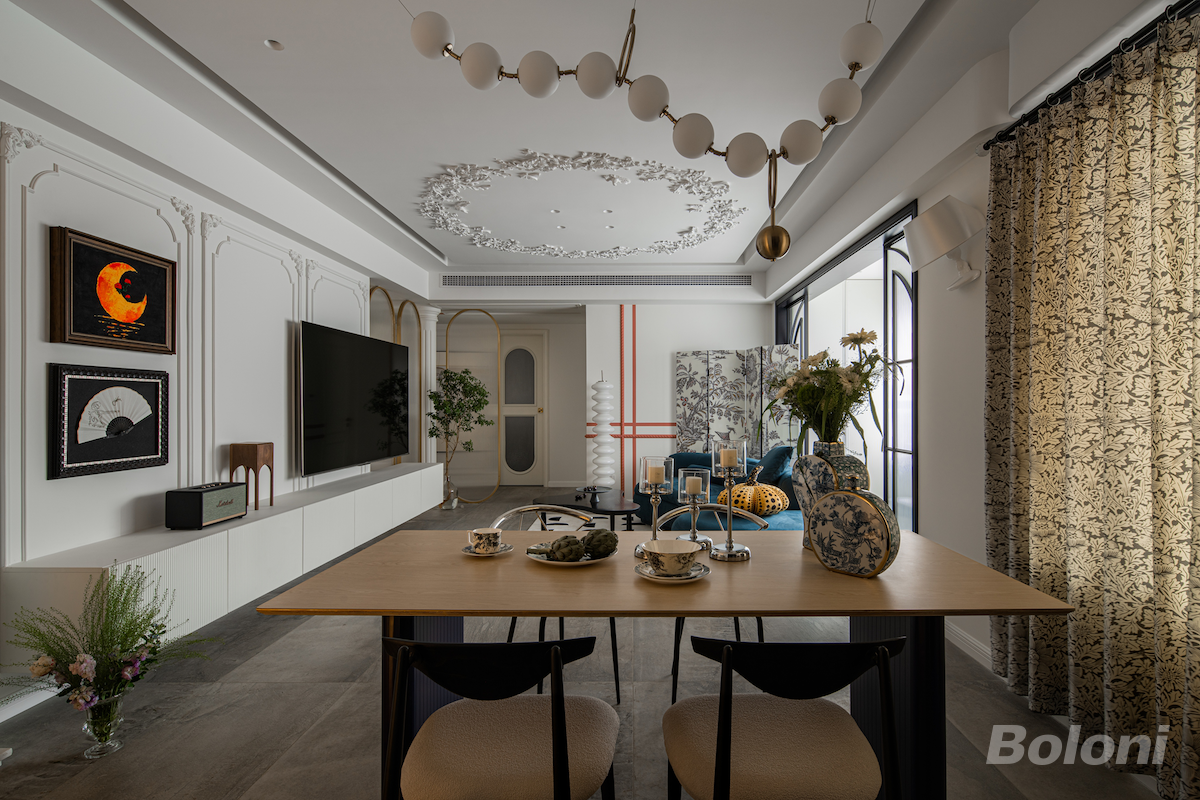 不囿于某种规制,选择珍珠项链玻璃球吊灯(可根据调节改变样式)搭配克莱因蓝现代简约餐桌(在公共空间中亦可充当书桌使用)。右侧为一扇1400mm窗户,利用花草图案窗帘进行装饰,塑造出别致的用餐氛围。 在这里,空间与行为活动产生更密切的联结,让屋主在日常之中体验到日常之上的、舒适惬意的生活状态。