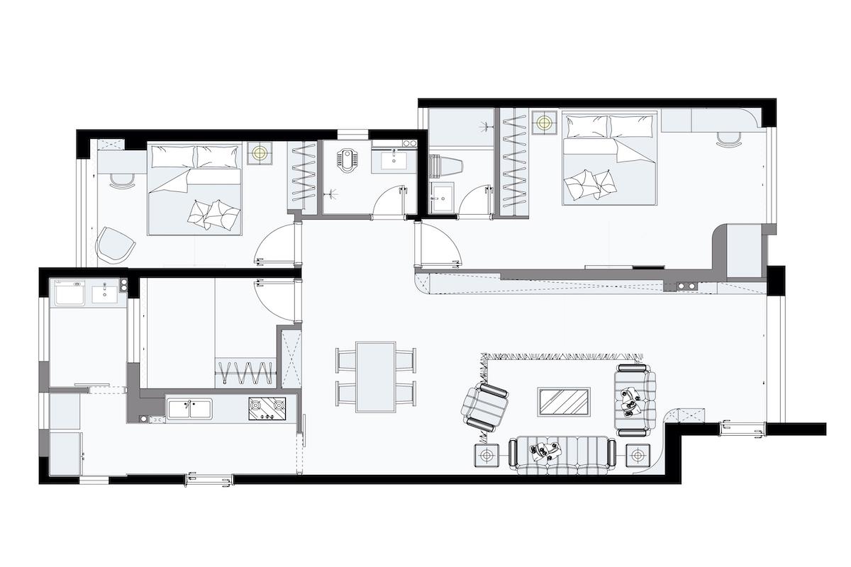 保留三居室的格局,最小房间阳台作为单独的洗衣间,晾晒区,客厅阳台用作休闲区域,电视墙整体定做,延伸到阳台,拉伸了整个电视墙的比例,扩大客厅的视觉冲击感。