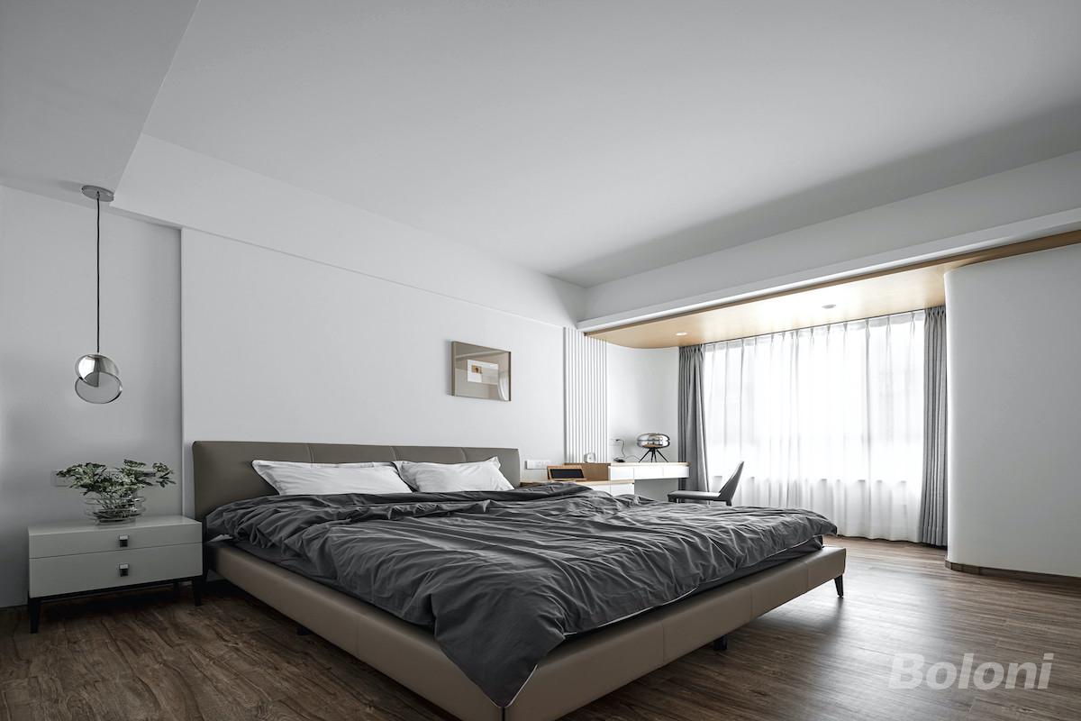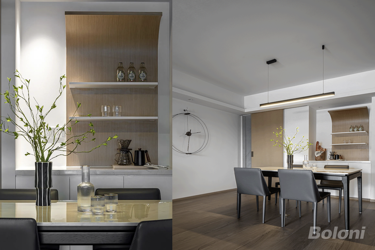 弧线独特的表现力,时而优雅,时而奔放,运用在家居环境中,时尚又充满张力。简约的几何条纹贯穿整个空间,整体白色点缀木色,增添温馨感。
