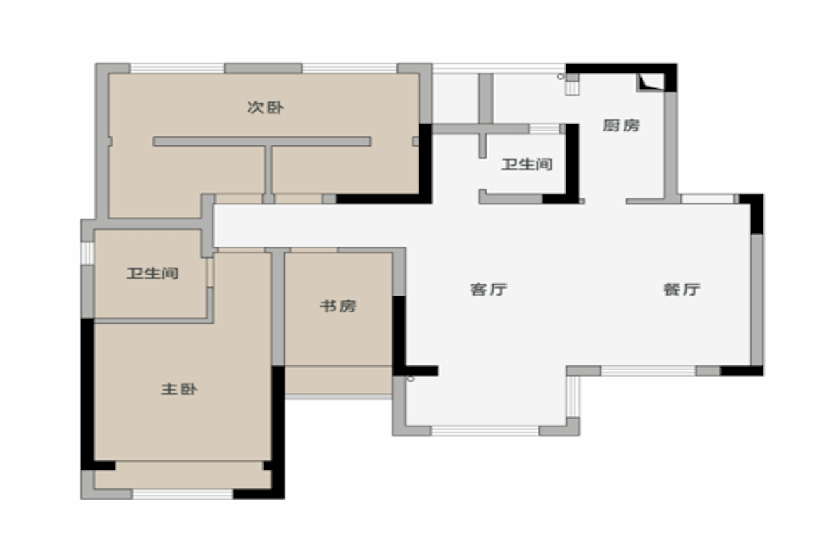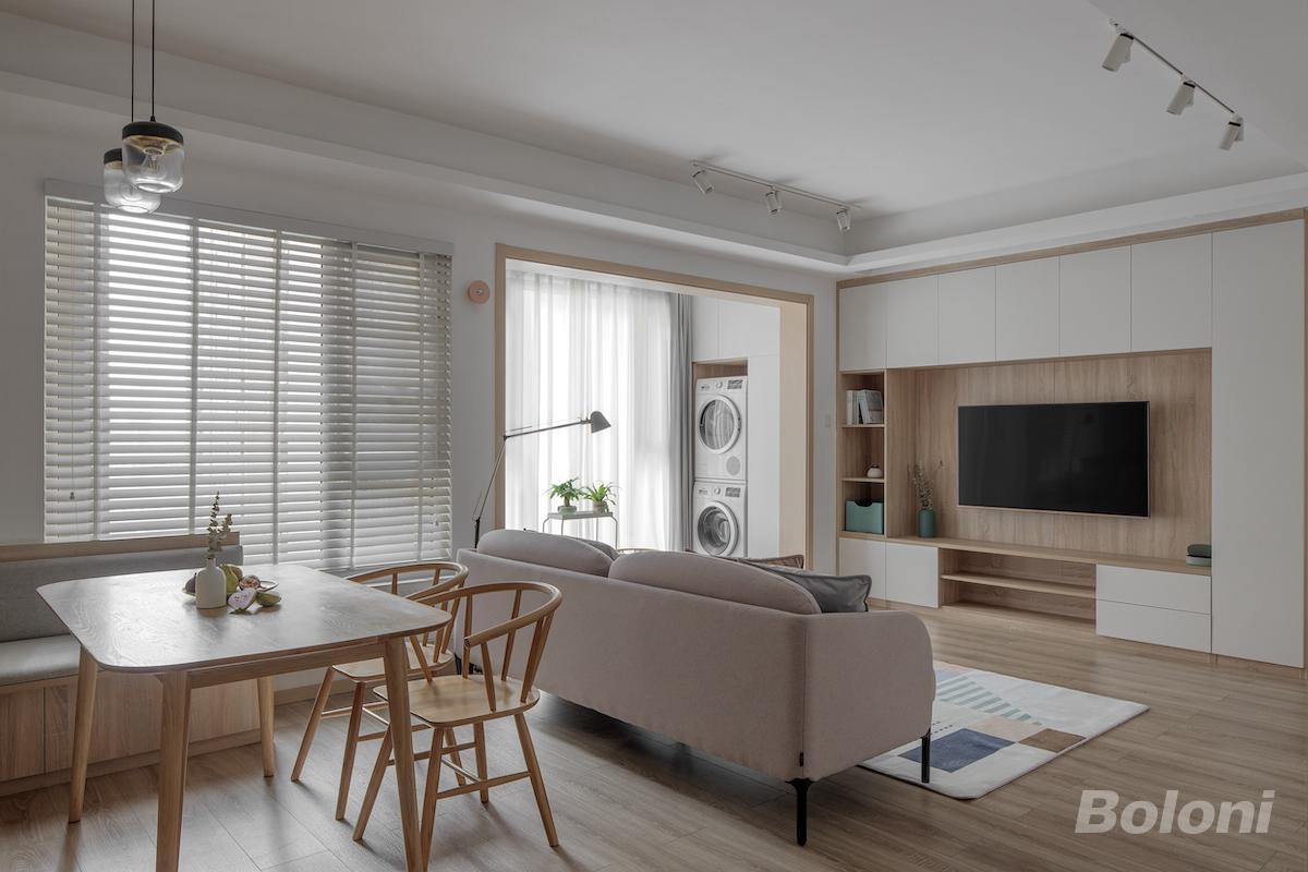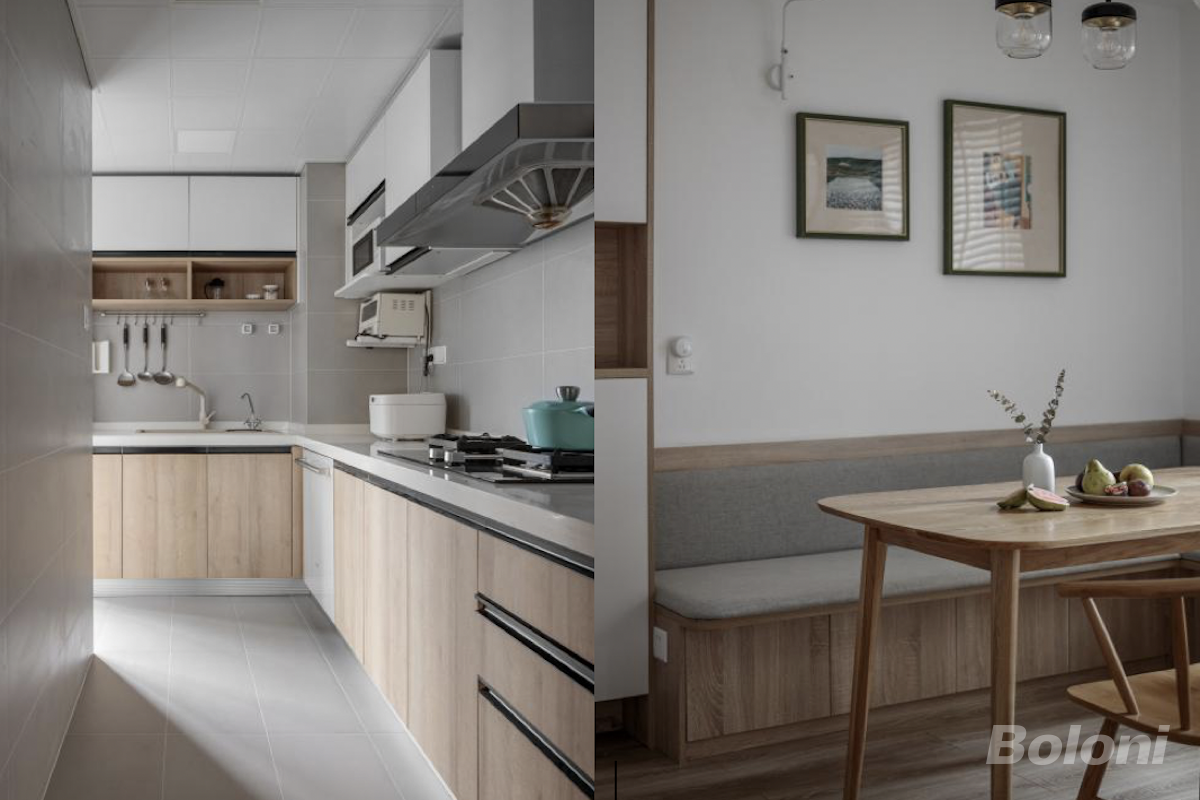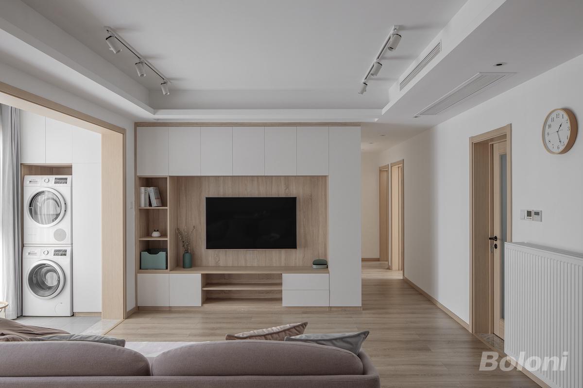户型为四室两厅非常方正,于是我们在尽可能保留空间原始结构的前提下,通过调整空间,布局优化生活动线,再利用柜体定制最大化利用空间死角,提升储物空间。为当下及未来3-5年的空间成长,进行留白。 客厅部分以沙发为客餐厅隔断,转角卡座缩减了餐厅使用面积,而功能及使用却丝毫不受影响。体量感较小的低矮家具,除了在视觉上拉伸客厅层高外,更具灵活移动性。在这里,它可以被任意组合轻松变化。玩体感游戏、练习瑜伽,都能