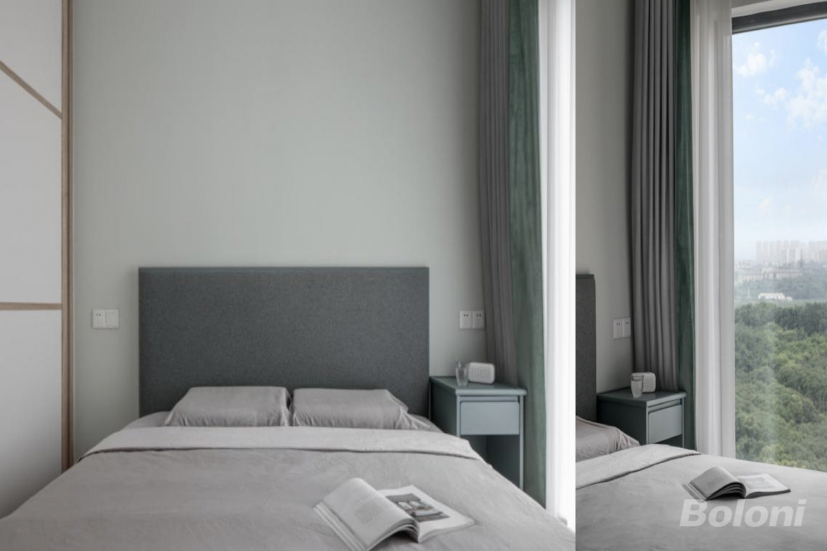 次卧同样以素雅简洁的居住方式呈现,右侧整面的落地窗将采光很好的引进室内,舒适自然。对于屋主而言,解除生活困惑的唯一方式是丢掉多余的交际负担,远离羊群式生活,在属于自己的世界当中去探索其他的可能。