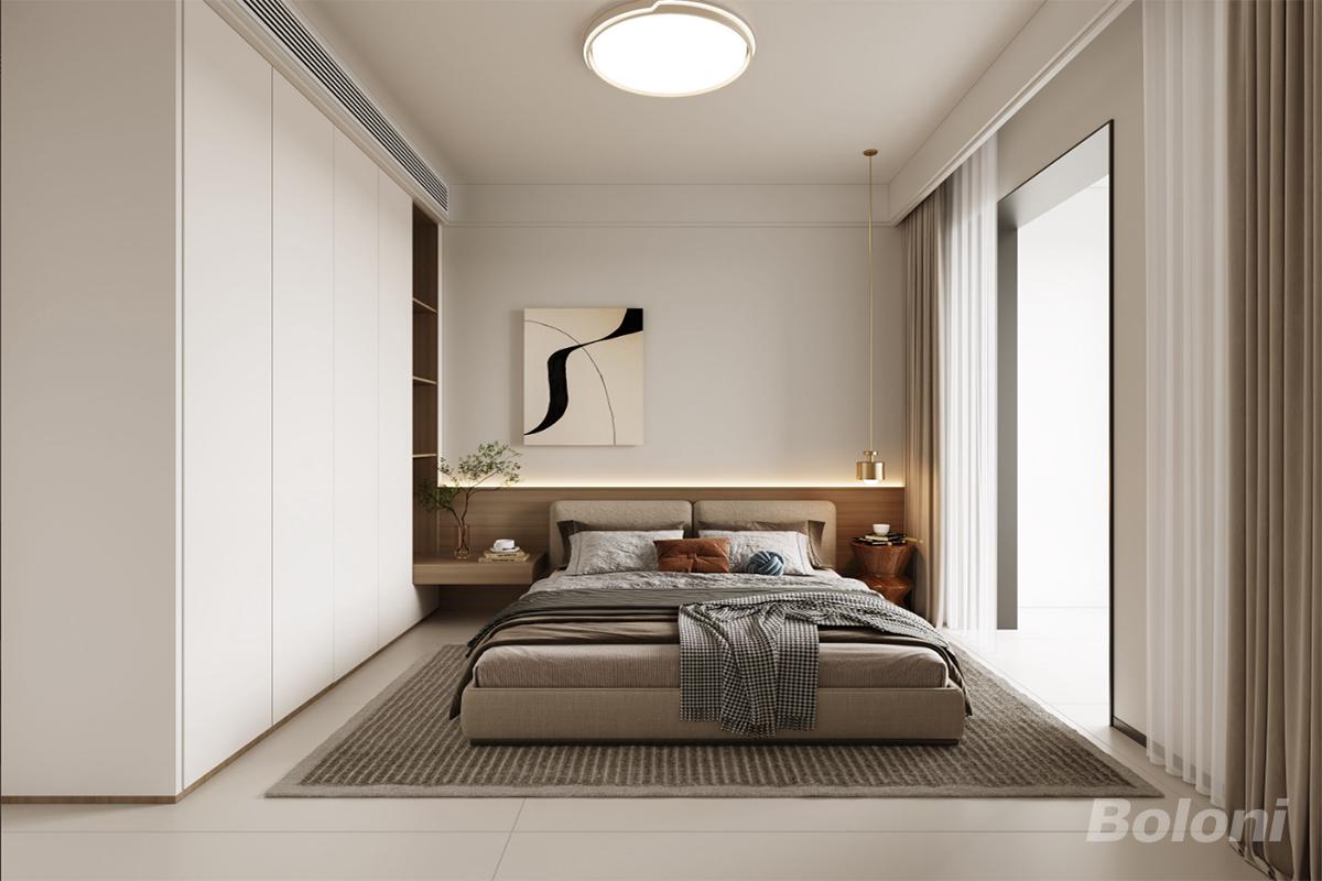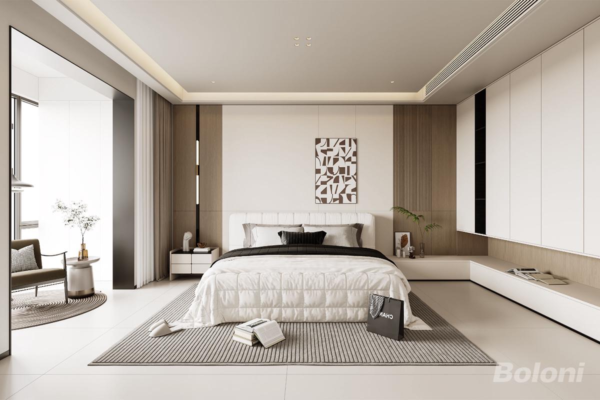 主卧的设计以白色为主,原木色色系为辅,注入了素雅气质和品质感的融合,对称的纹理线条结合拱型的分区设计,将艺术与生活结合,打造出现代时尚的氛围。
