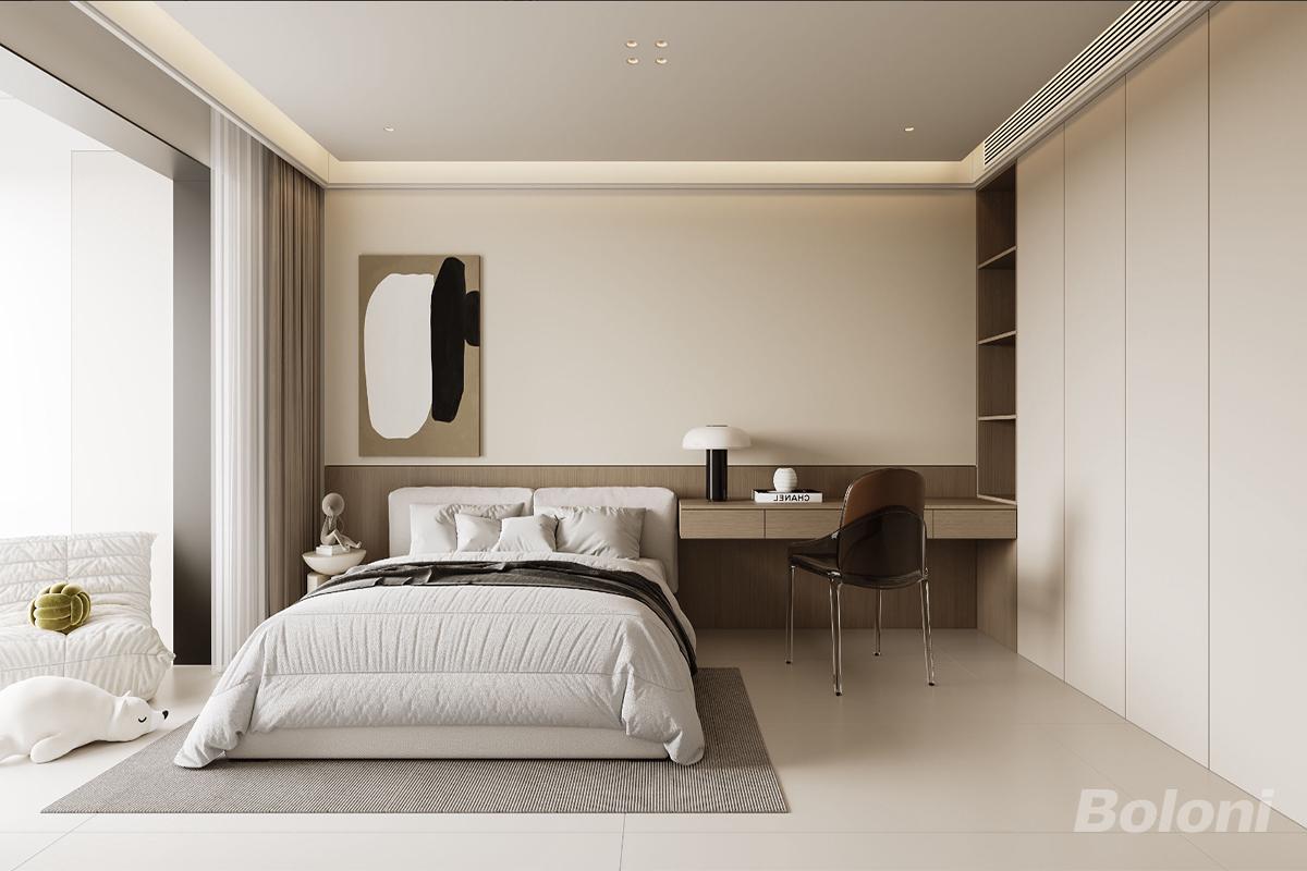 次卧的设计上延续了整体的配色,暖色调和原木的搭配,具有意式轻奢的氛围,也有文艺复兴时期的艺术感,营造出精致、简约又具有现代感的家。