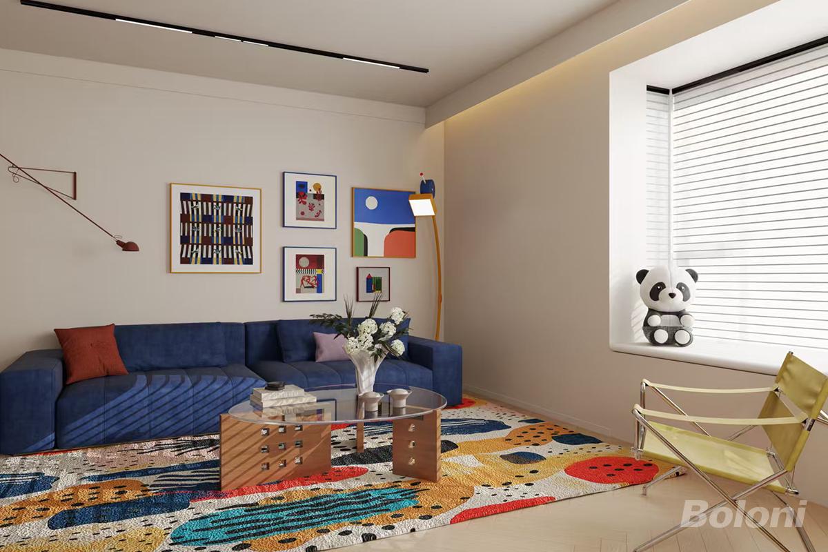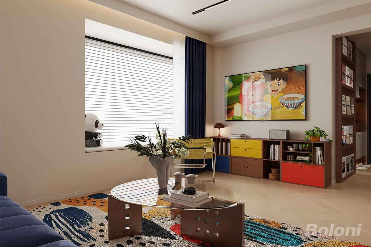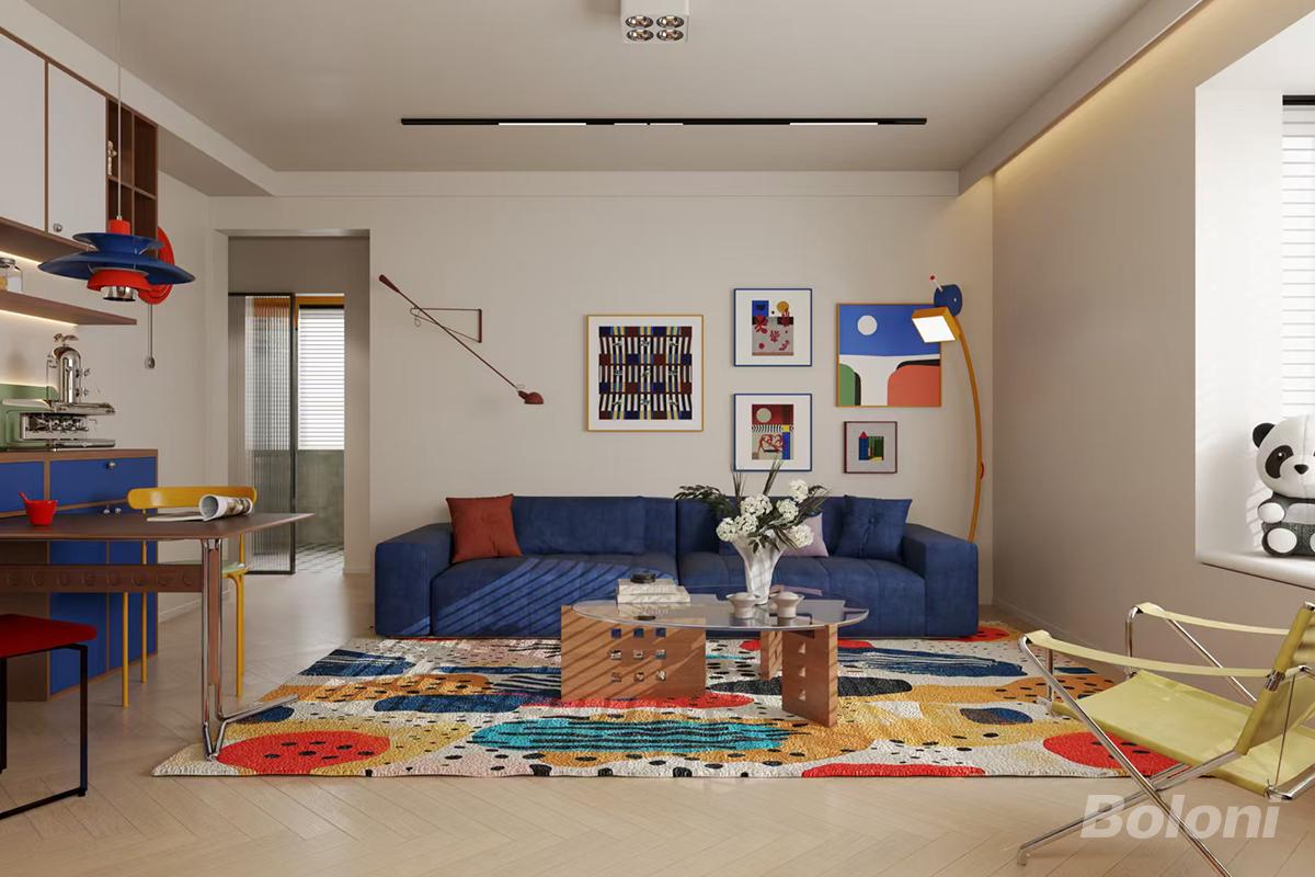 形式追随功能”是本案设计核心原则,家具和软装必然是这个家的主角。搭配几何图案的地毯、钢材皮质沙发,红黄蓝单品画龙点睛,空间层次跃然眼前。