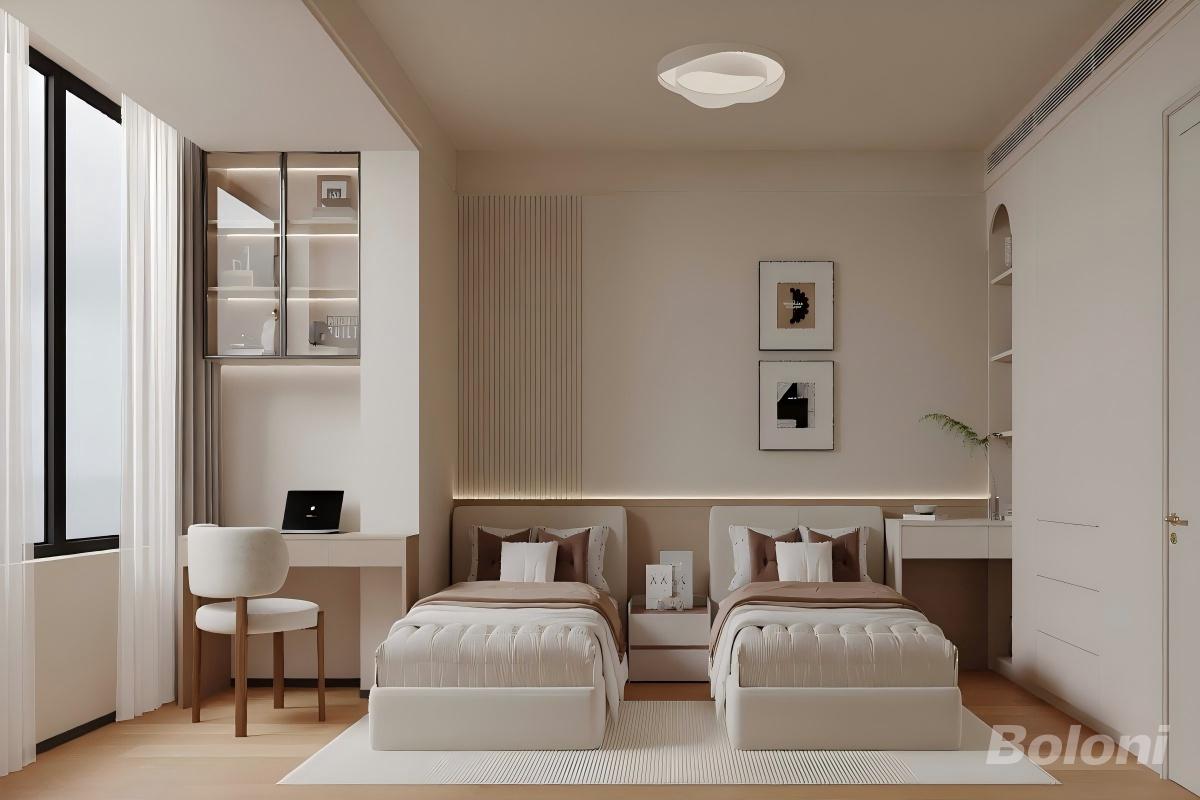 儿童房有两个女儿一起居住,所以采用两张1.2米的单人床的模式,增加床头护墙板及灯带增加氛围,阳台空间改造书桌
