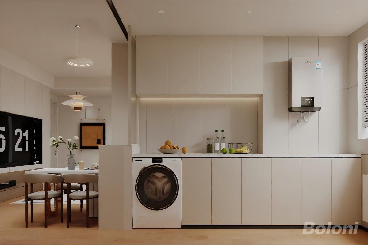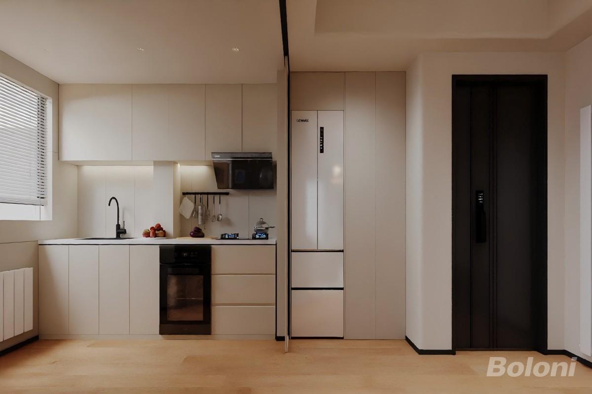 将原本厨房的隔墙打掉,使用柜体连接,推拉门收至推拉门内,增加整体空间的通透感及储物空间,增加整体柜体的连接性