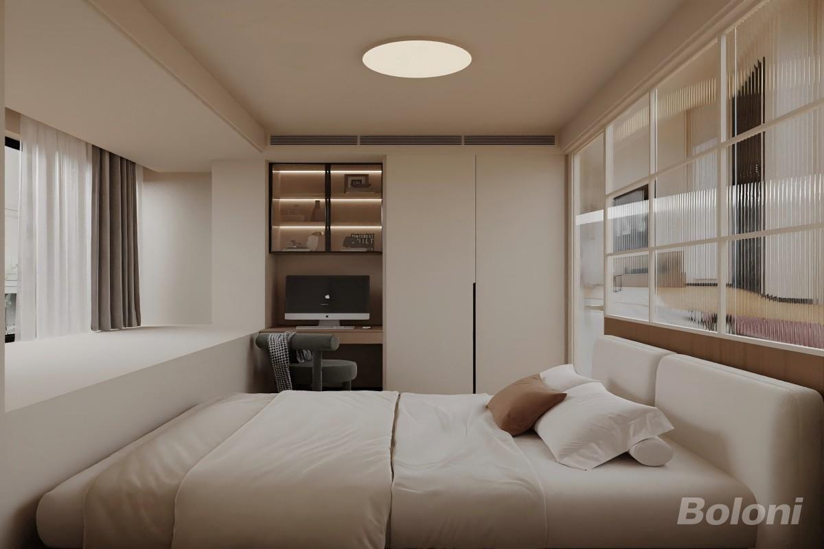 主卧空间是原本客厅隔断出来的房间,床头为半高墙加上窗户的形式,增加客厅空间的通透性,衣柜与书桌连接,增加储物