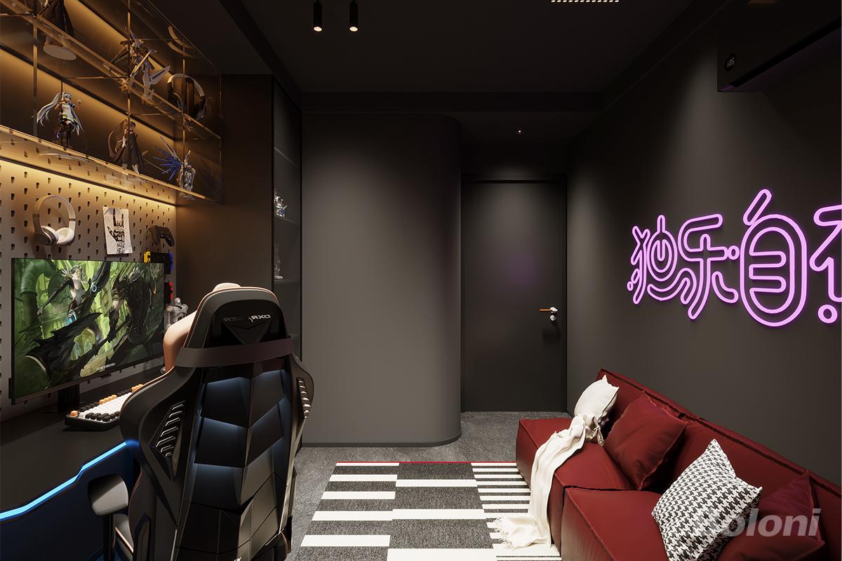 末来感主色调,整体是以黑白为主调的极简风格深色系家居,使周围环境看起来更稳定同时很好地营造出硬朗科技感,让人放松身心,愉快电竞。