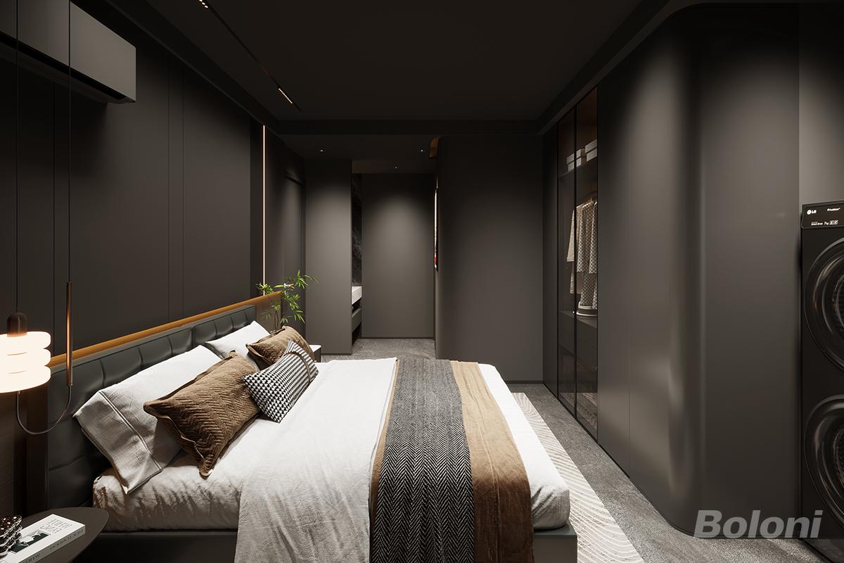 卧室,是暗黑雅痞风的另一片天地。黑色格栅壁饰、灰色石材浴室,每一处细节都透露着不凡的品味。透过窗纱,微光洒进,与爱人共赏斜阳,享受这份难得的宁静与美好。