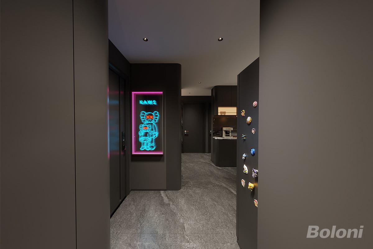 以深灰色为主的墙面、地面材质,营造出冷静、高级的极简基调;而霓虹灯的荧光粉、亮蓝以及右侧装饰件的多彩元素,形成鲜明的色彩碰撞,既不会让空间显得单调,又通过色彩层次强化了视觉焦点。