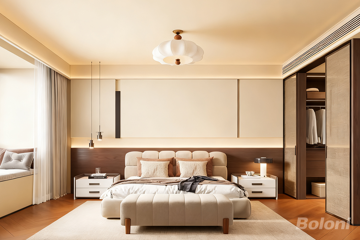 这是一间现代风格的卧室,整体以柔和的暖色调为主,营造出温馨舒适的氛围。 卧室中央摆放着一张造型简约大气的床,搭配多个质感柔软的抱枕,床尾的软包床凳,既美观又能提供临时坐卧的便利。床两侧是白色的床头柜,上面摆放着灯具、水杯等物品,满足日常使用需求。 一侧有嵌入式的大衣柜,柜门部分采用木质与布艺结合的设计,兼具美观与收纳功能,打开的柜门内可看到挂放的衣物,收纳空间充足。 靠近窗户的位置设置了飘窗,搭配
