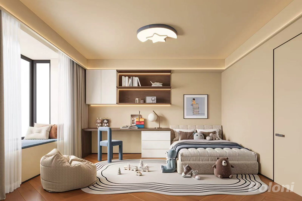 这是一间儿童房,整体采用温暖柔和的色调,营造出舒适且充满童趣的氛围。 房间内,床的设计简洁,上面摆放着多个可爱的毛绒玩具,增添了温馨感。床旁的墙面挂有一幅装饰画,画中是与书籍相关的元素,契合儿童房的学习氛围。 靠窗区域设置了书桌与书架,书架上整齐摆放着书籍和一些小摆件,书桌旁配有一把蓝色的椅子,为孩子提供了专属的学习空间。窗户边的飘窗,铺上软垫,放上几个抱枕,成为一处惬意的休闲小角落,白色的窗帘让