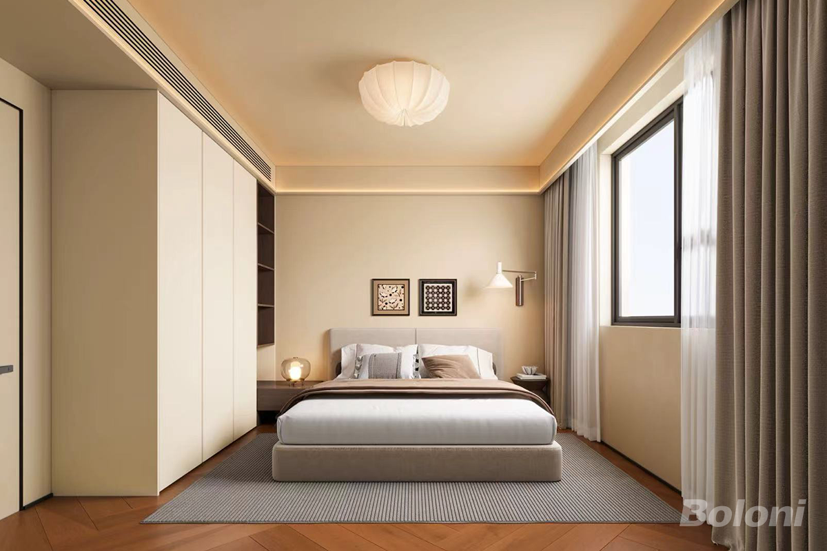 这是一间现代风格的卧室,整体以柔和的暖色调为主,营造出温馨舒适的氛围。 卧室中央摆放着一张简约大气的床,搭配多个质感柔软的抱枕,床尾的设计简洁利落。床两侧是小巧的床头柜,左侧床头柜上放置着一盏造型别致的台灯,右侧则有一些小物件,满足日常使用需求。 一侧是大面积的嵌入式衣柜,柜门采用简洁的设计,提供了充足的收纳空间,方便整理衣物等物品。 靠近窗户的位置,悬挂着双层窗帘,外层是深色的布艺窗帘,内层是白