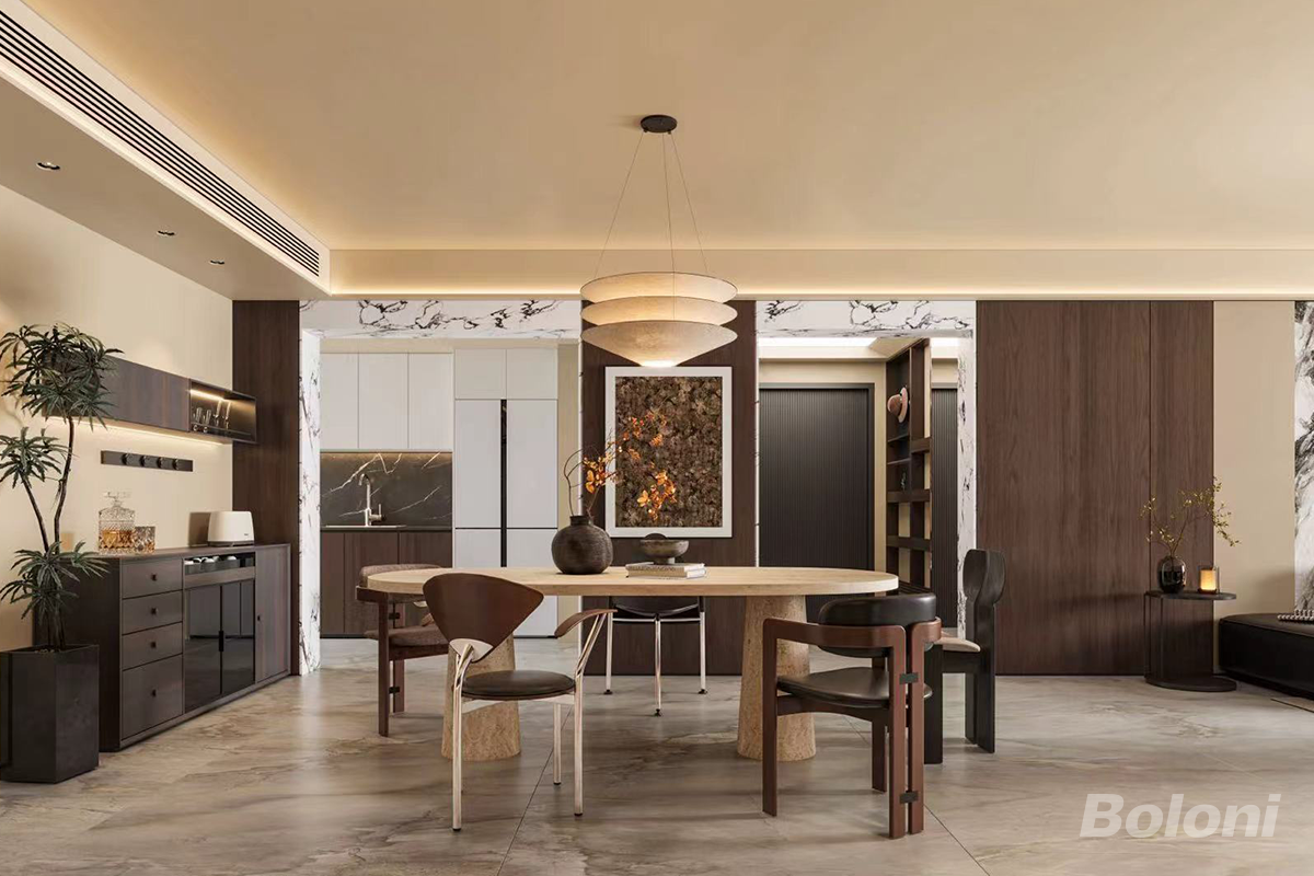餐厅区域,圆形餐桌搭配造型各异的椅子,既具设计感又能满足不同使用需求。上方悬挂着层次分明的吊灯,为用餐提供充足且富有氛围的照明。餐桌上摆放着花瓶与花枝,增添了自然生机与雅致感。 厨房部分,以白色橱柜为主,搭配深色台面,简洁大方,收纳与操作空间规划合理。旁边的深色储物柜,兼具展示与收纳功能,柜上摆放的物品丰富了空间层次。 空间中还设置了休闲角落,深色沙发搭配小边几,边几上的烛台与植物,营造出舒适放松