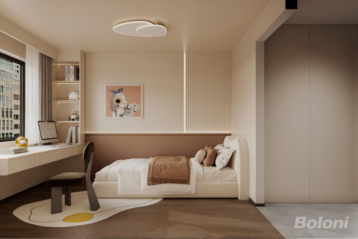 儿童房采用活跃一些的橙色和奶油黄的碰撞,使整个空间更加活跃,窗边书桌增加了墙面的使用空间,释放地面空间