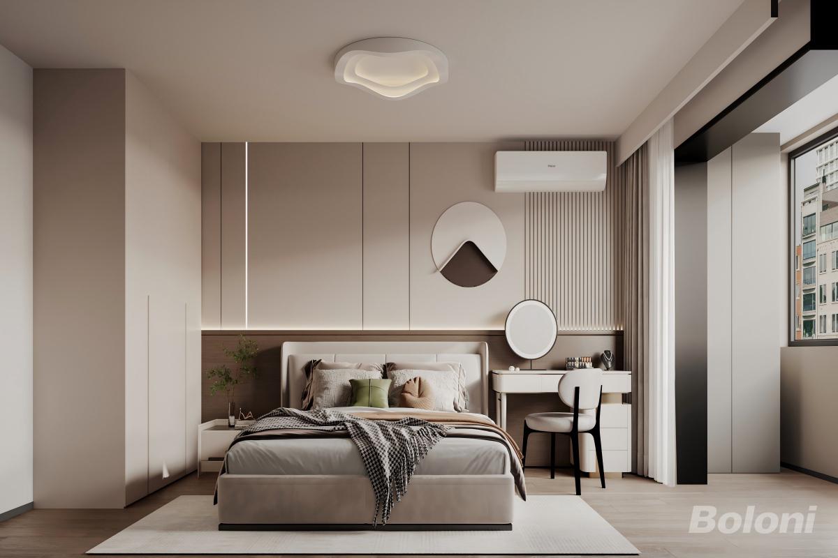 卧室依旧选用现代简约风格,床头护墙板使用奶色和深棕色拼接,墙面铝条和灯光增加色彩元素及空间的活动感。