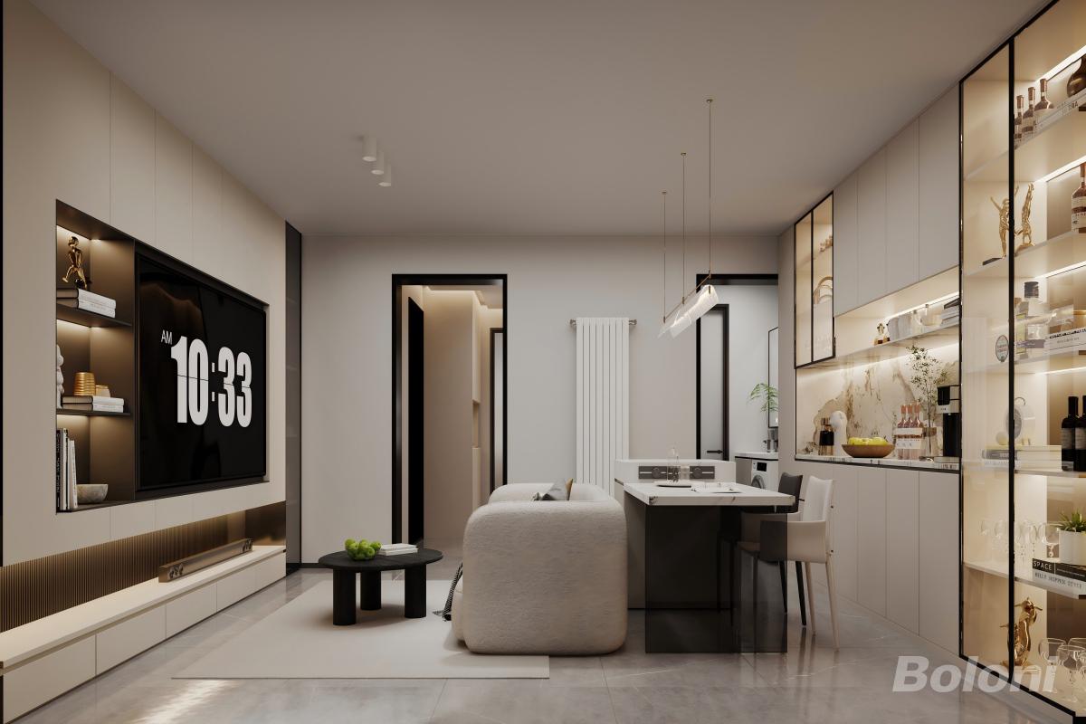 客餐厅整体风格为现代简约风格,整体色调采用奶油色调,整体呈现温柔,温暖的居住体验,整面的餐边柜及电视柜增加了极大的储物空间