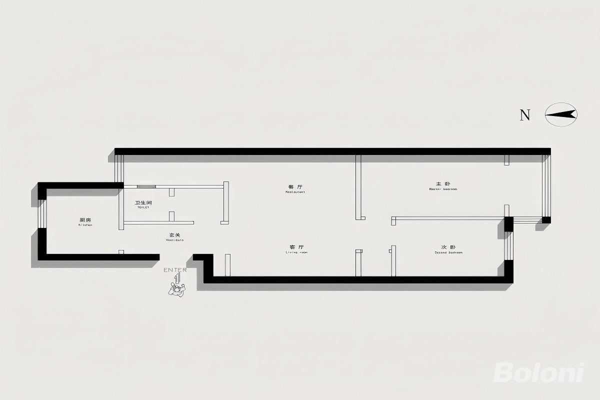 保留两居室的卧室空间,将卫生间改为明卫,干湿分离,客厅餐厅设计为客餐厅一体设计,形成“回”字形动线。