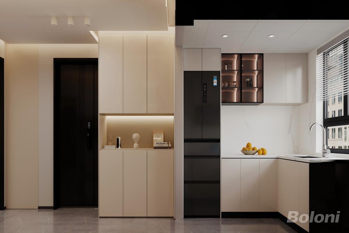 厨房保留原始空间,将门洞移位,使厨房橱柜为“U”字形橱柜,增加厨房的台面使用空间,整体依旧使用现代简约风格