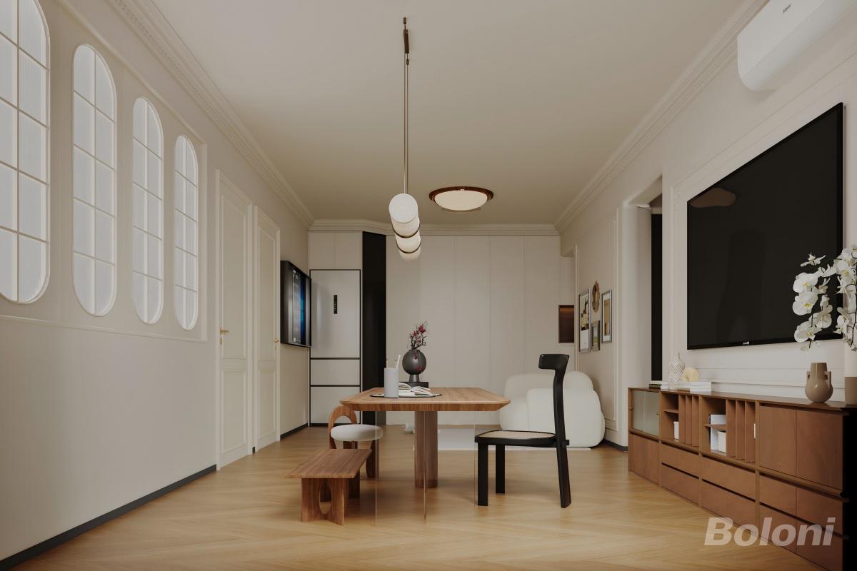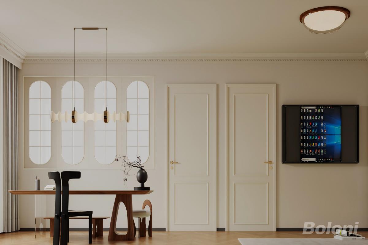 整体为现代简约中古风,采用大面积的奶油白加上胡桃木家具的配色,墙面及顶面点缀一些简单的石膏线条,增加层次感