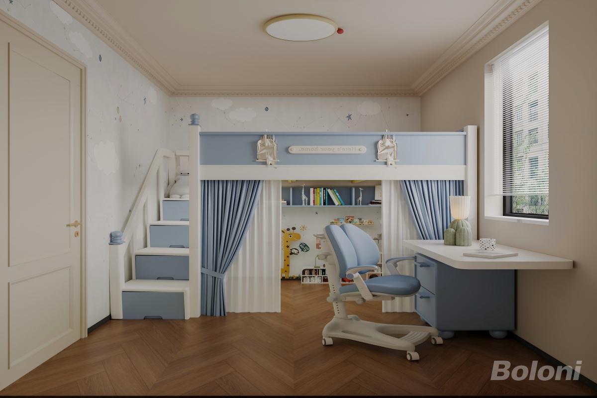 儿童房采用上床下活动的设计,满足休息的需求的同时增加孩子的自由活动区域,有效使用立面空间释放地面空间