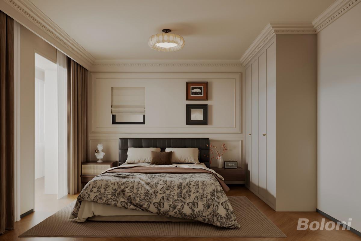 主卧整体依旧是现代简约带一些法式元素,整体色调为奶油白和木色调的结合,背景墙为上下两圈石膏线增加整体空间的灵动感