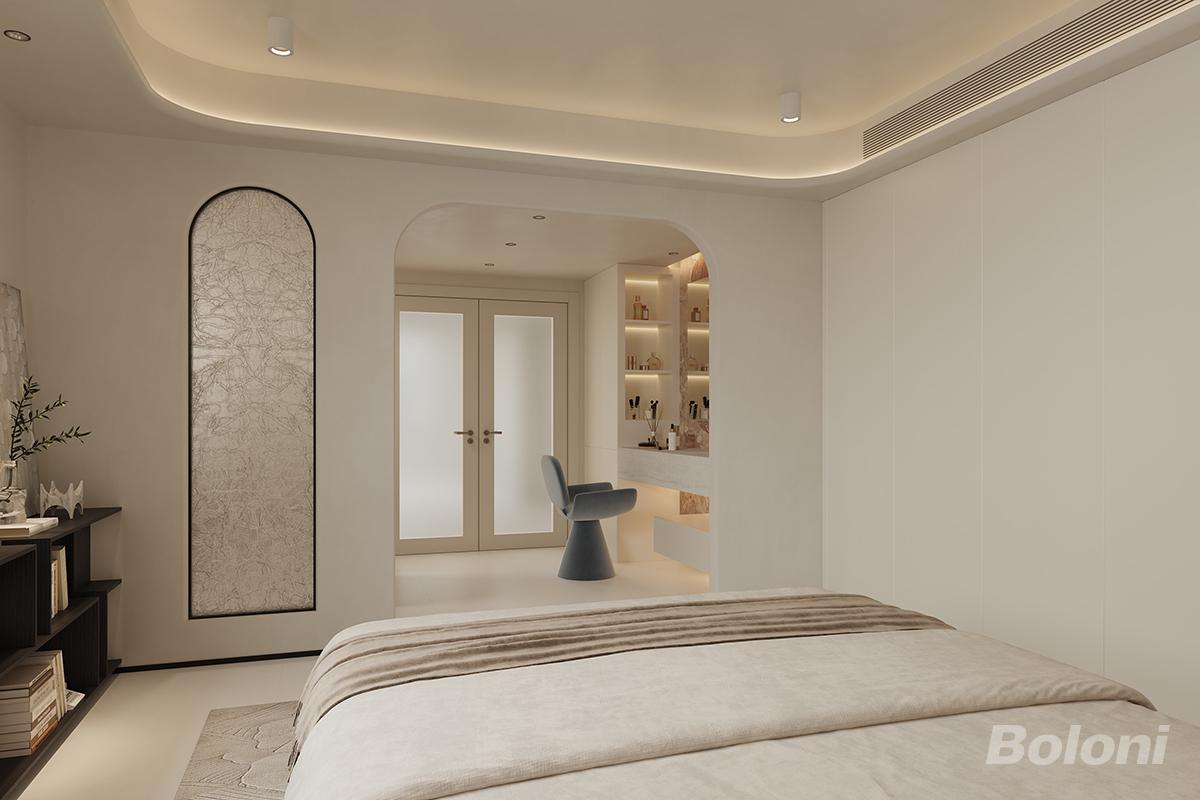 卧室配备了大面积的白色衣柜,提供充足收纳空间,保持空间整洁有序。顶部的线性灯光设计柔和,与整体风格相得益彰,营造出静谧惬意的睡眠环境,将法式浪漫、奶油风的柔和与轻奢精致完美融合。墙面的拱形设计元素极具法式风情,其中一幅带有复杂纹理的装饰画,为空间增添了艺术感与细节层次;另一处拱形门洞连通着梳妆台区域,梳妆台上的灯光设计精致,搭配灰色的时尚座椅,形成一个独立且富有格调的梳妆空间,满足居者的梳妆需求。